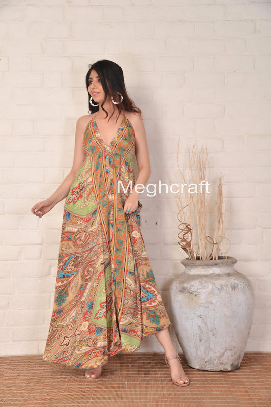 Elevate your summer style with our flowy Silk Halter Maxi Dress, perfect for beach vacations, brunch dates, or barefoot walks by the sea. Made from soft, breathable silk, this dress features a flattering halter neckline, an airy silhouette, and vibrant bohemian prints that capture...- $ 45.00