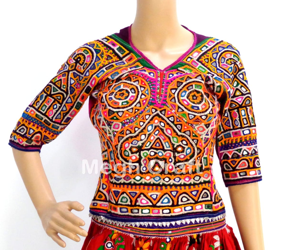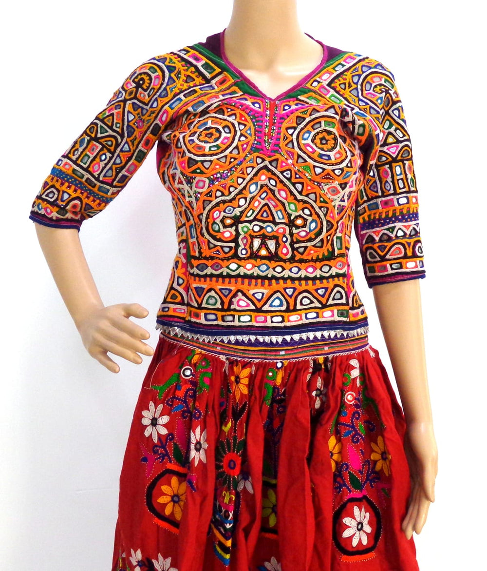 Blusa india vintage hecha a mano con trabajo tribal Kapda sin espalda adornada con bordado a mano y trabajo de espejo. Esta es una blusa sin espalda bordada vintage coleccionable y bien conservada.