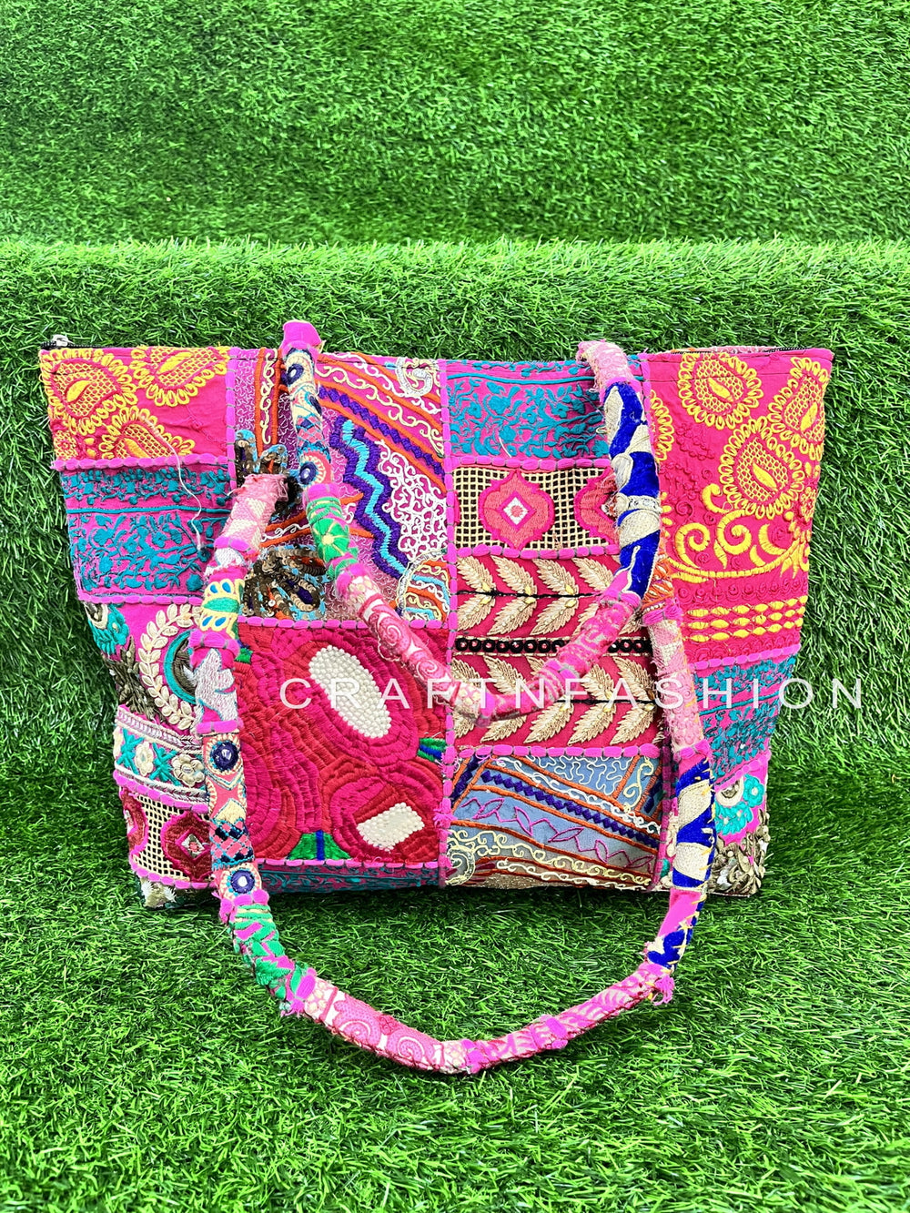 Exclusivo bolso tote de patchwork de moda bohemia. Este es un auténtico bolso bordado a mano de los nómadas tribales de Gujarat llamados Banjara.