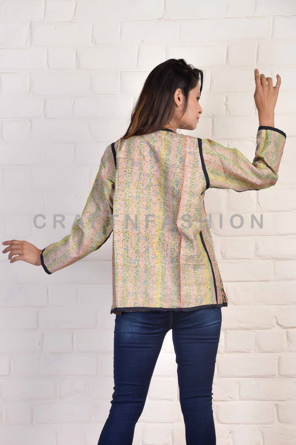Diseñador indio bohemio Kantha Shrug. Kantha Elegante abrigo de cintura reversible hecho a mano. Ideal para uso formal, uso diario, moda bohemia, chaqueta Kantha bohemia.