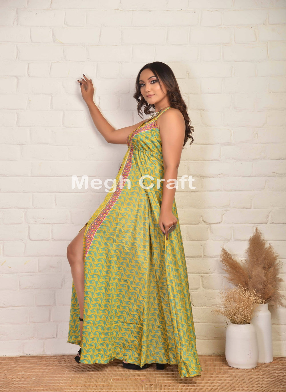 Vestido largo estilo sari de seda reciclada vintage indio de moda bohemia con abertura frontal.