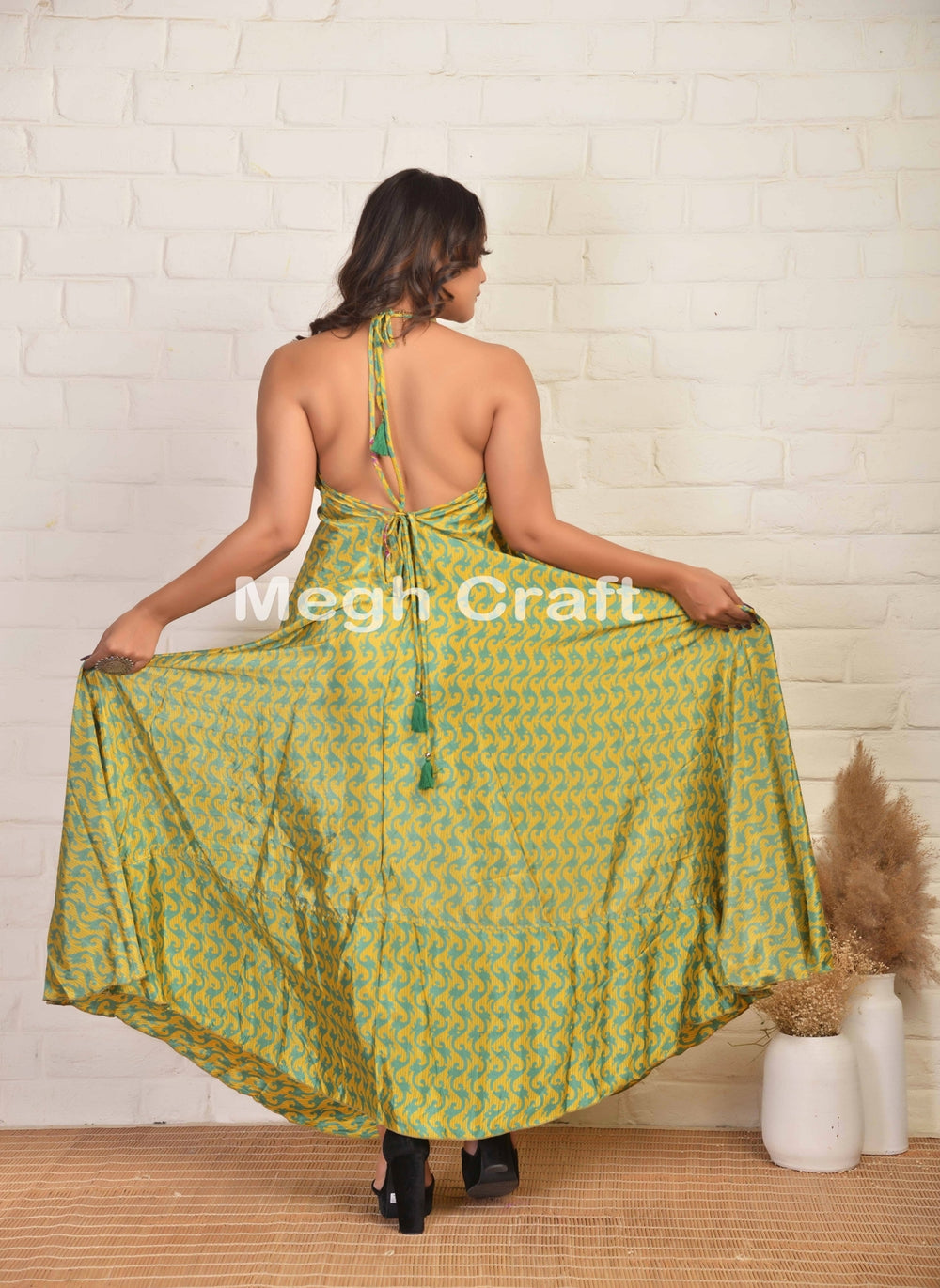 El tamaño BUST se adaptará y favorecerá a cualquier persona con tirantes largos para ajustar el escote halter, que también se puede atar debajo del busto para lograr una silueta griega ajustada.