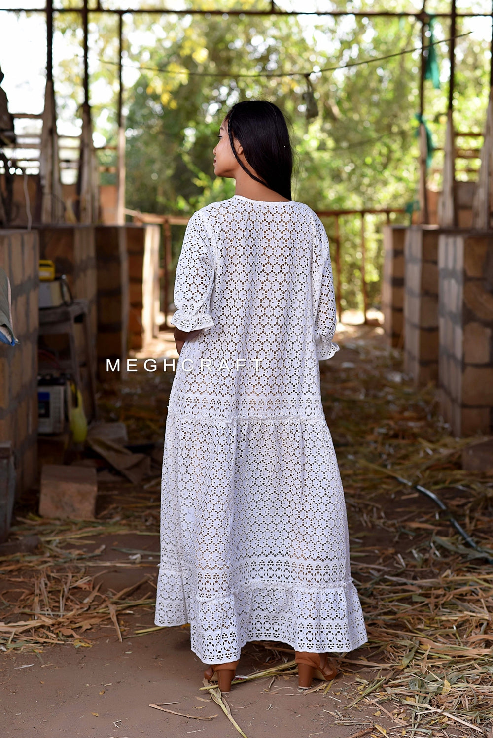 Vestido midi calado bordado del diseñador Schiffli. Ideal para uso en verano, playa, bodas, vestidos de dama de honor y ropa de moda.