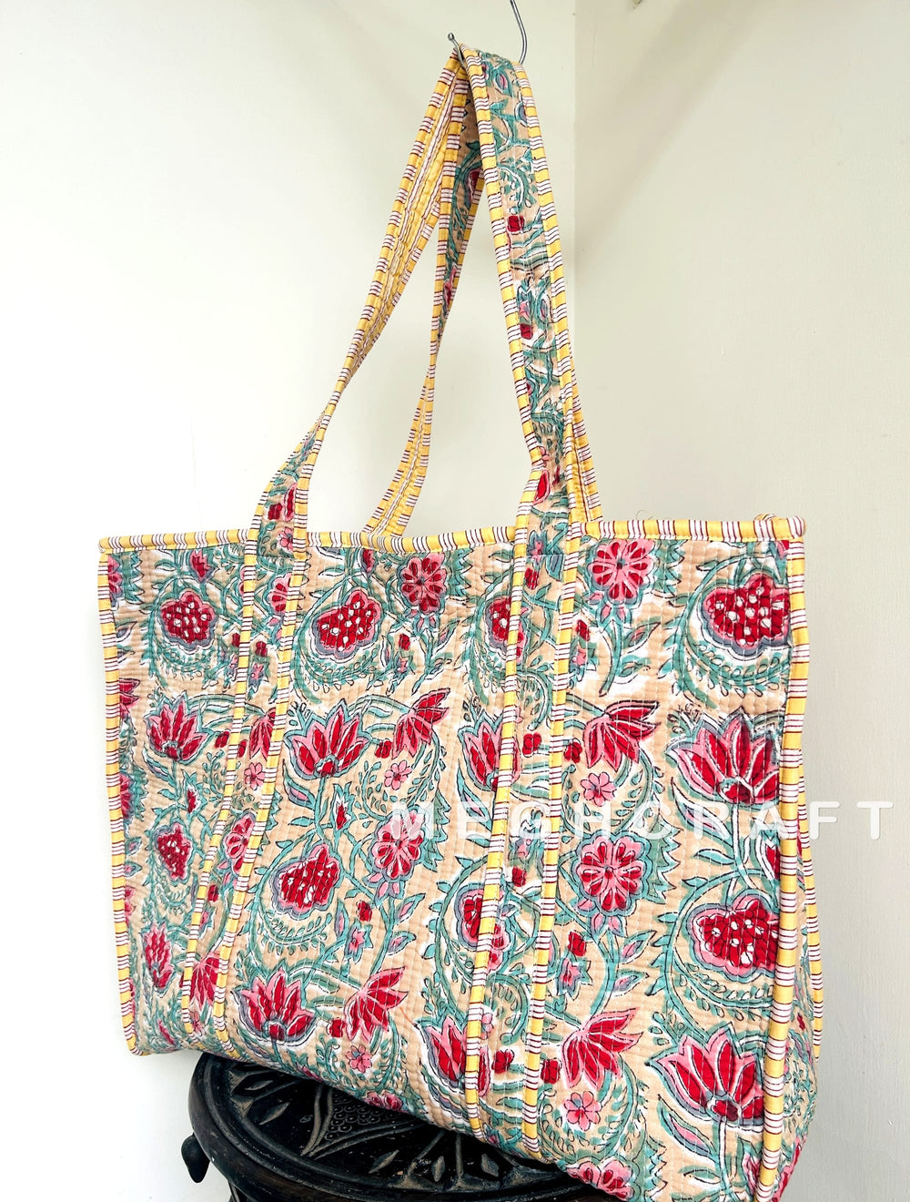 Our quilted totes are handmade by Indian artisans, so there may be some irregularities, and the print placement may vary by bag.