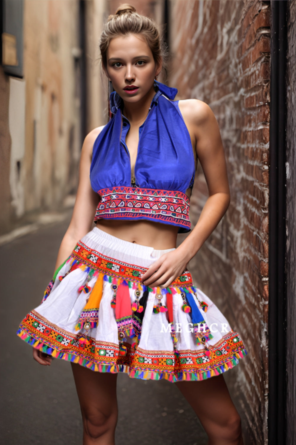 Minifaldas bordadas de moda bohemia para mujer. Minifalda de algodón con parche bordado y borde de flecos coloridos que te dará un look de moda boho gitano perfecto.