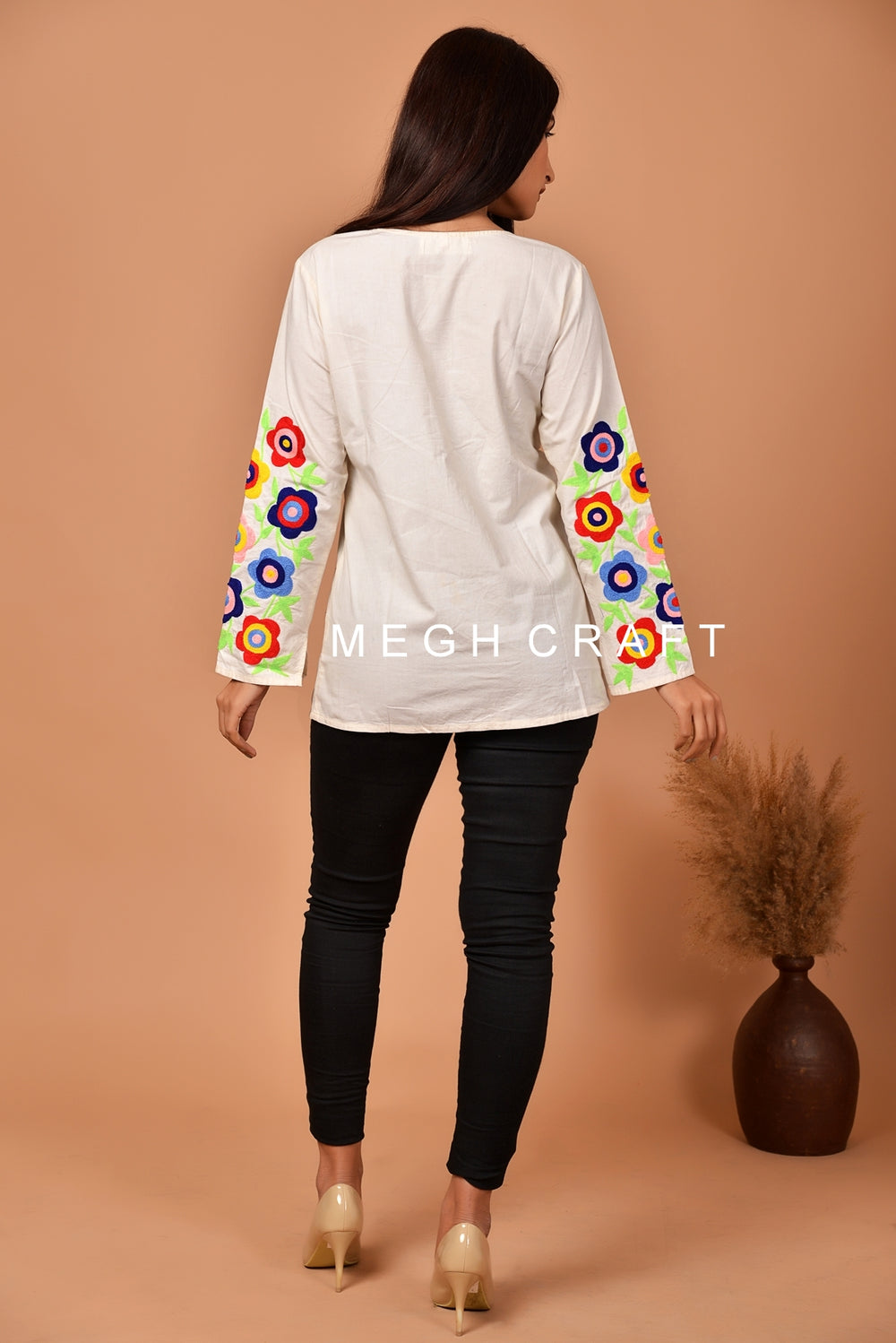 Top blanco bordado floral de rayón de diseñador. Ideal para ropa de playa, moda de verano, moda sostenible, moda bohemia y más.