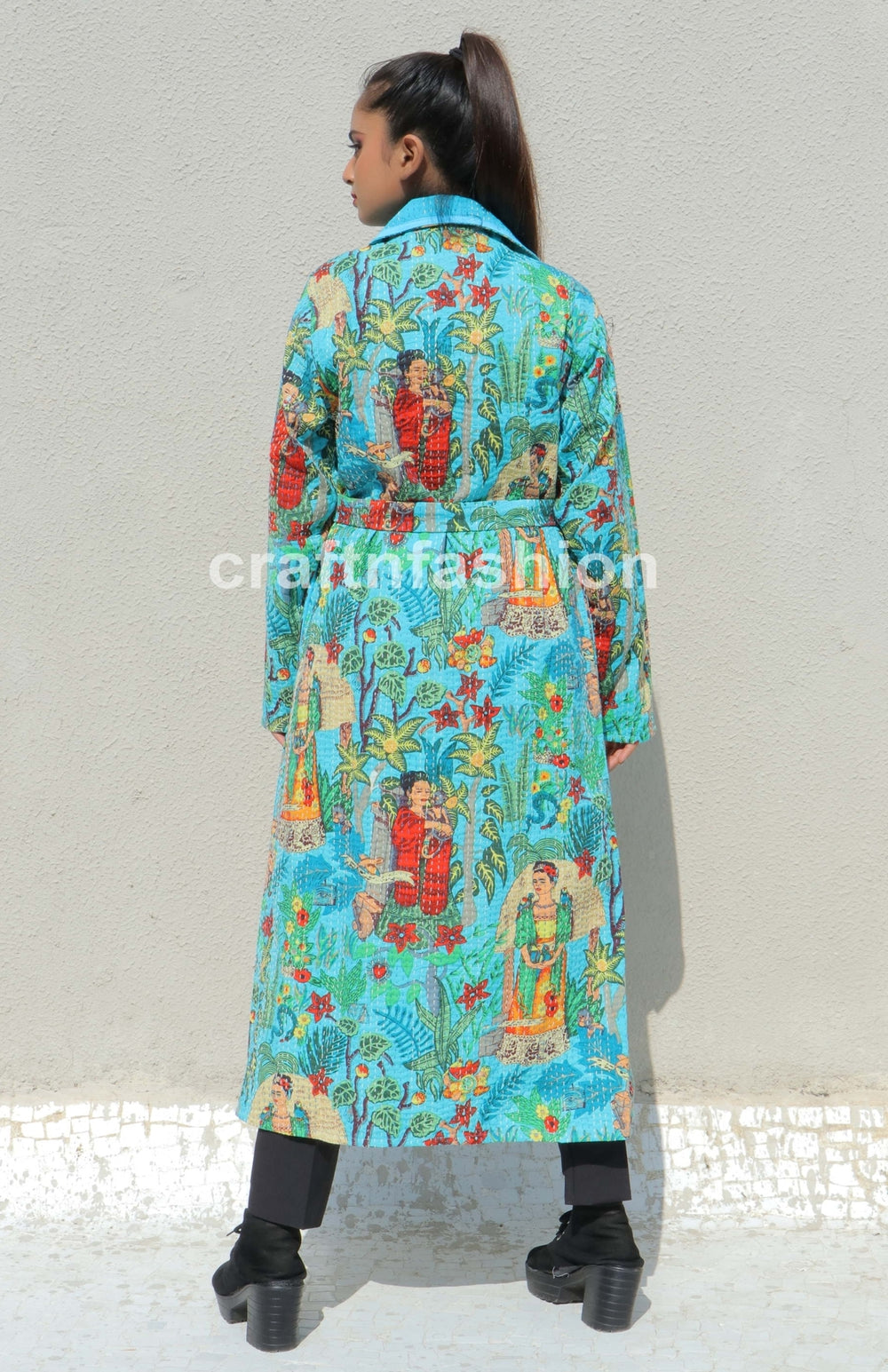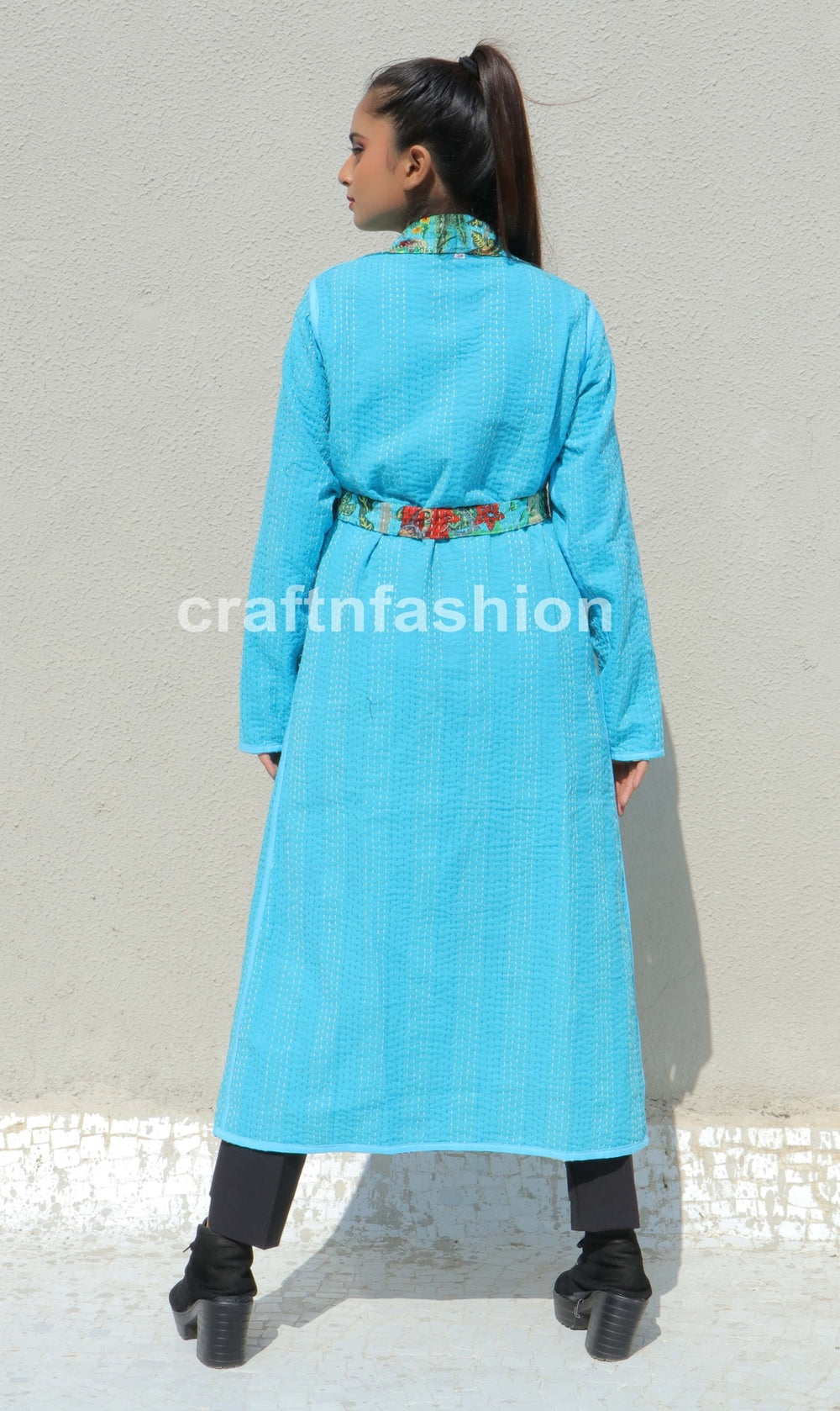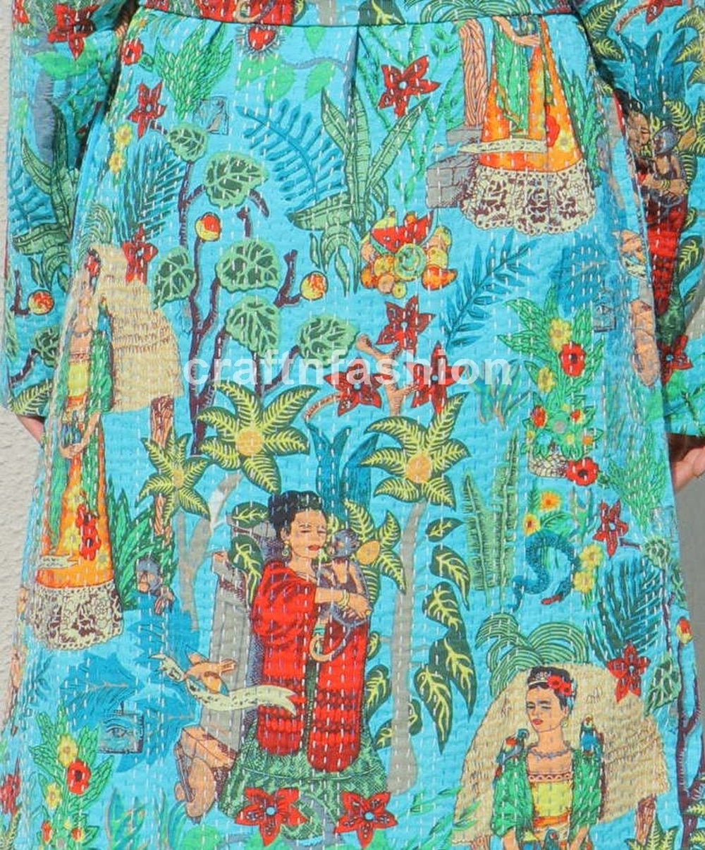 Chaqueta Kantha reversible hecha a mano con estampado bloqueado de algodón indio, larga.