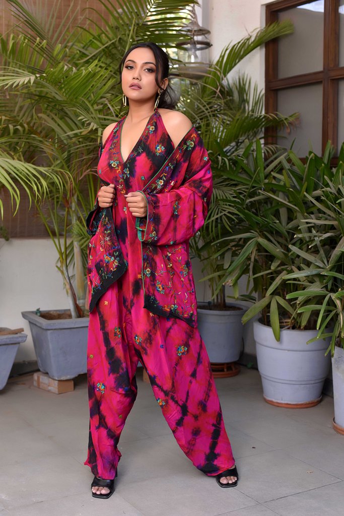Exclusivo diseñador Tie Dye Vintage adornado con lentejuelas hecho a mano Boho Party Wear Conjunto mágico de mono con cuello halter y kimono corto a juego, vestido completamente original y único.