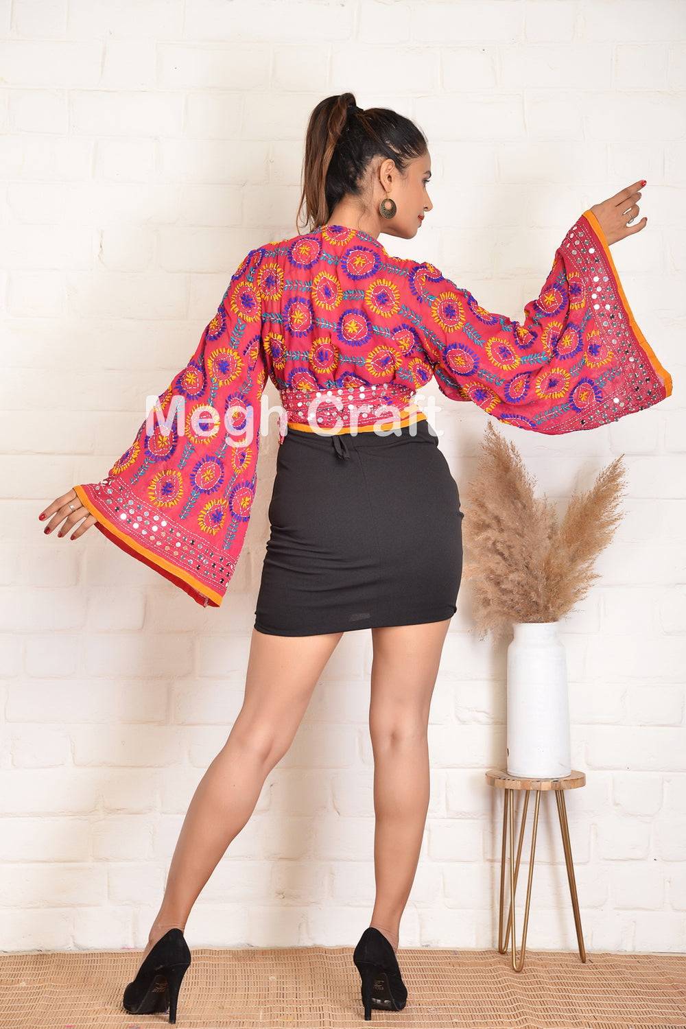 Top de manga acampanada hecho a mano con bordado indio de diseñador. Su parte superior con lazo puede ser flexible para cualquier tamaño.