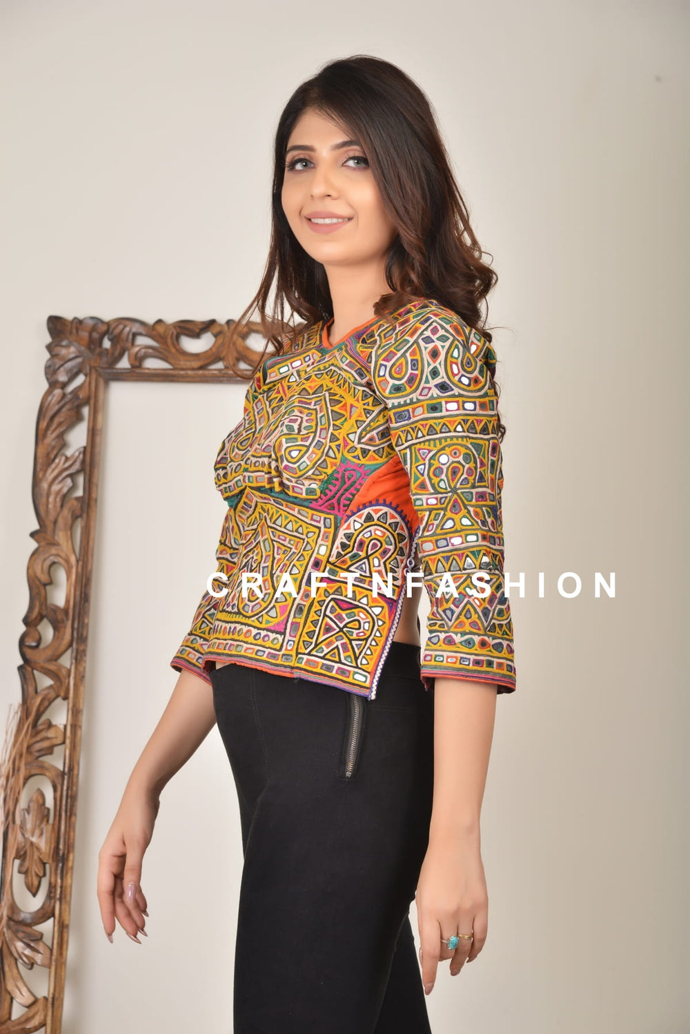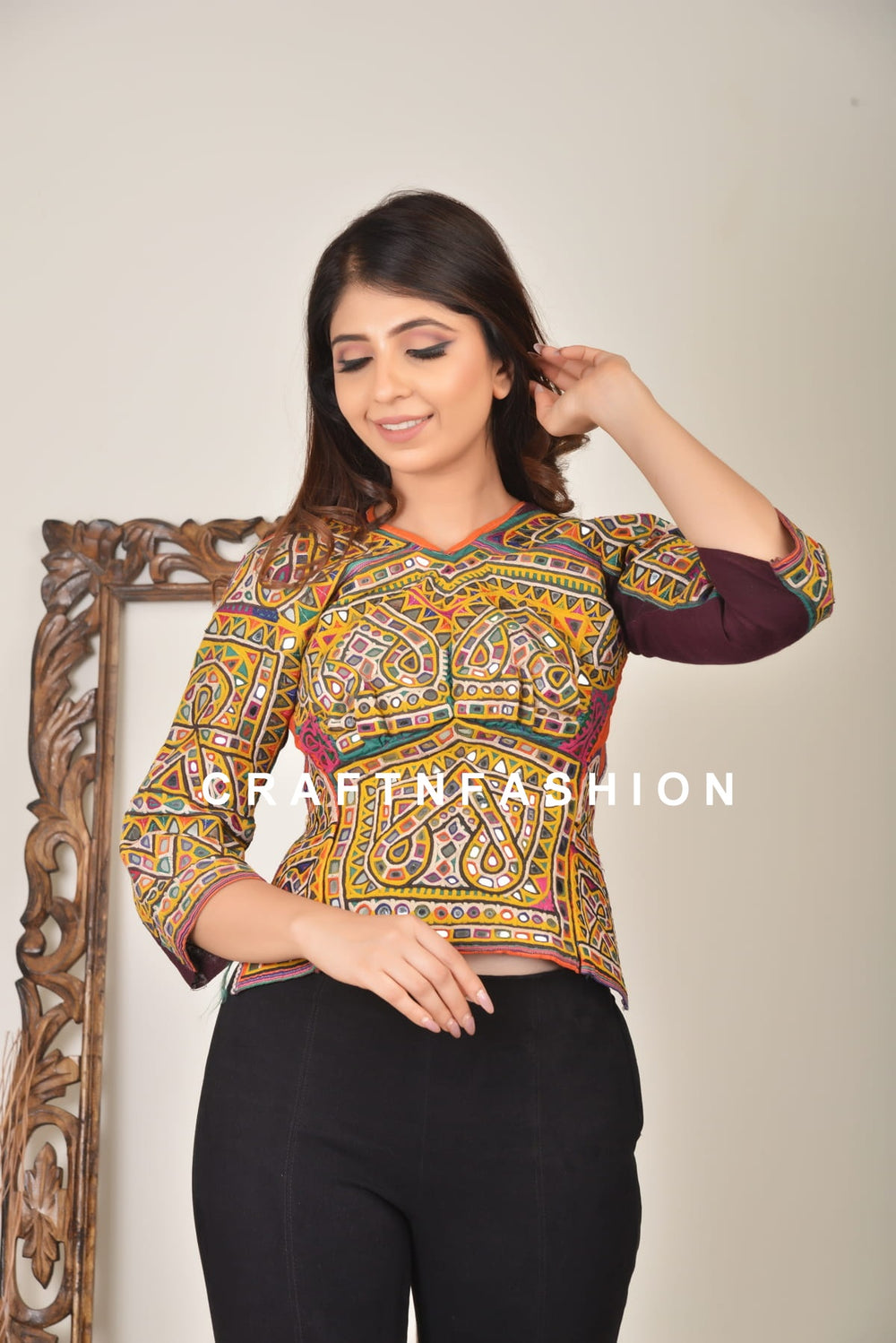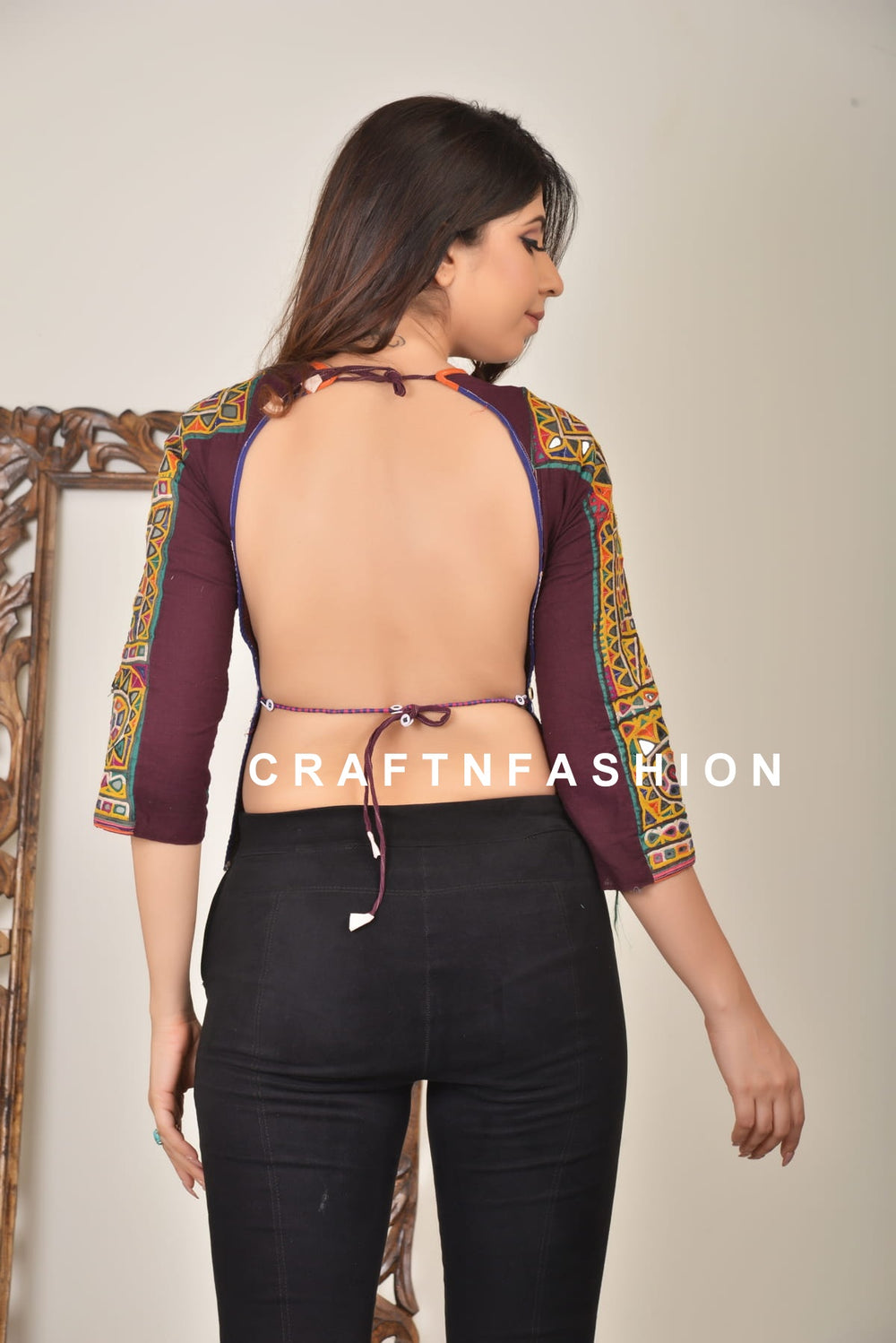 Blouse Kapda dos nu brodée Chemisier indien vintage fabriqué à la main pour travail tribal orné de broderies à la main et de travail miroir. Il s’agit d’un chemisier dos nu brodé vintage bien conservé de collection.