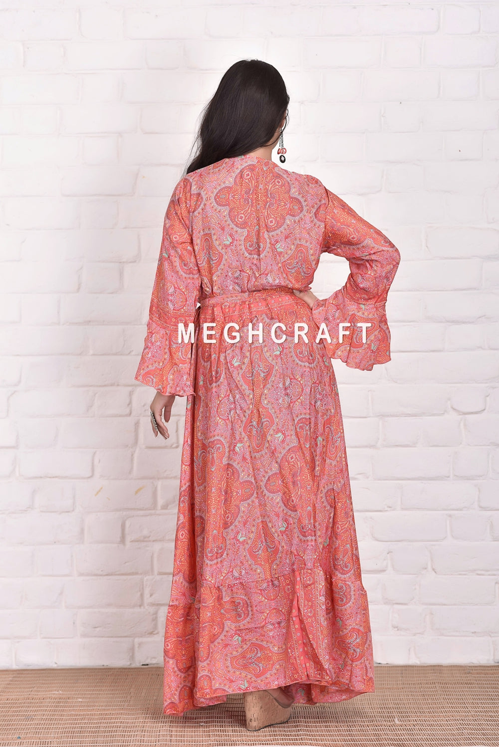 Robe kimono portefeuille en soie bohème, manches cloche. Longue longueur, coupe ample, douce et confortable.