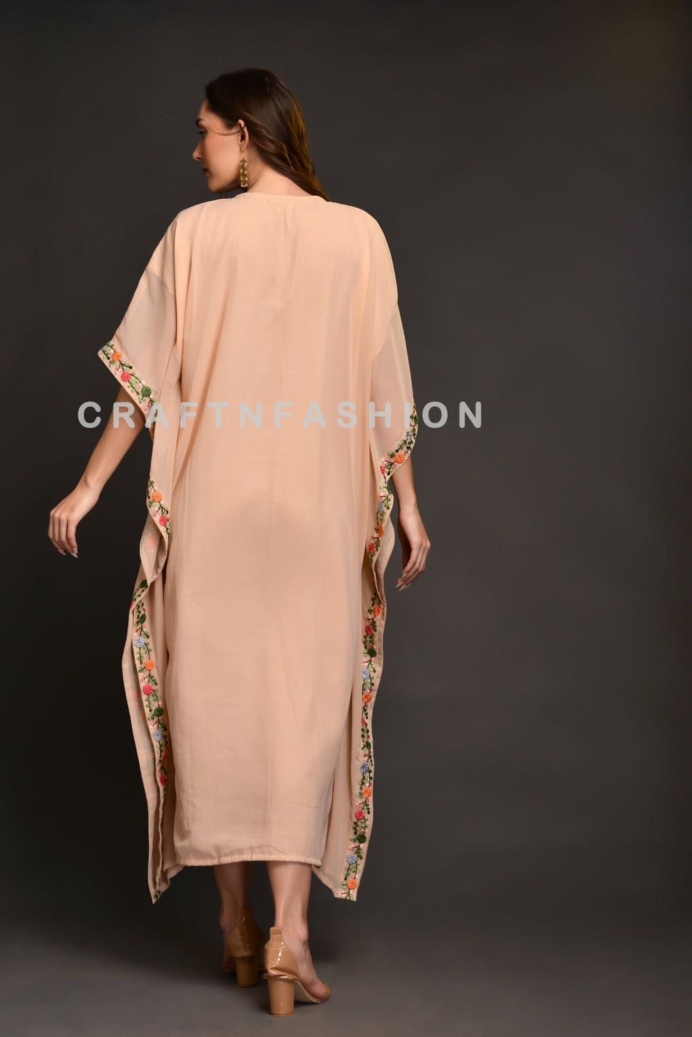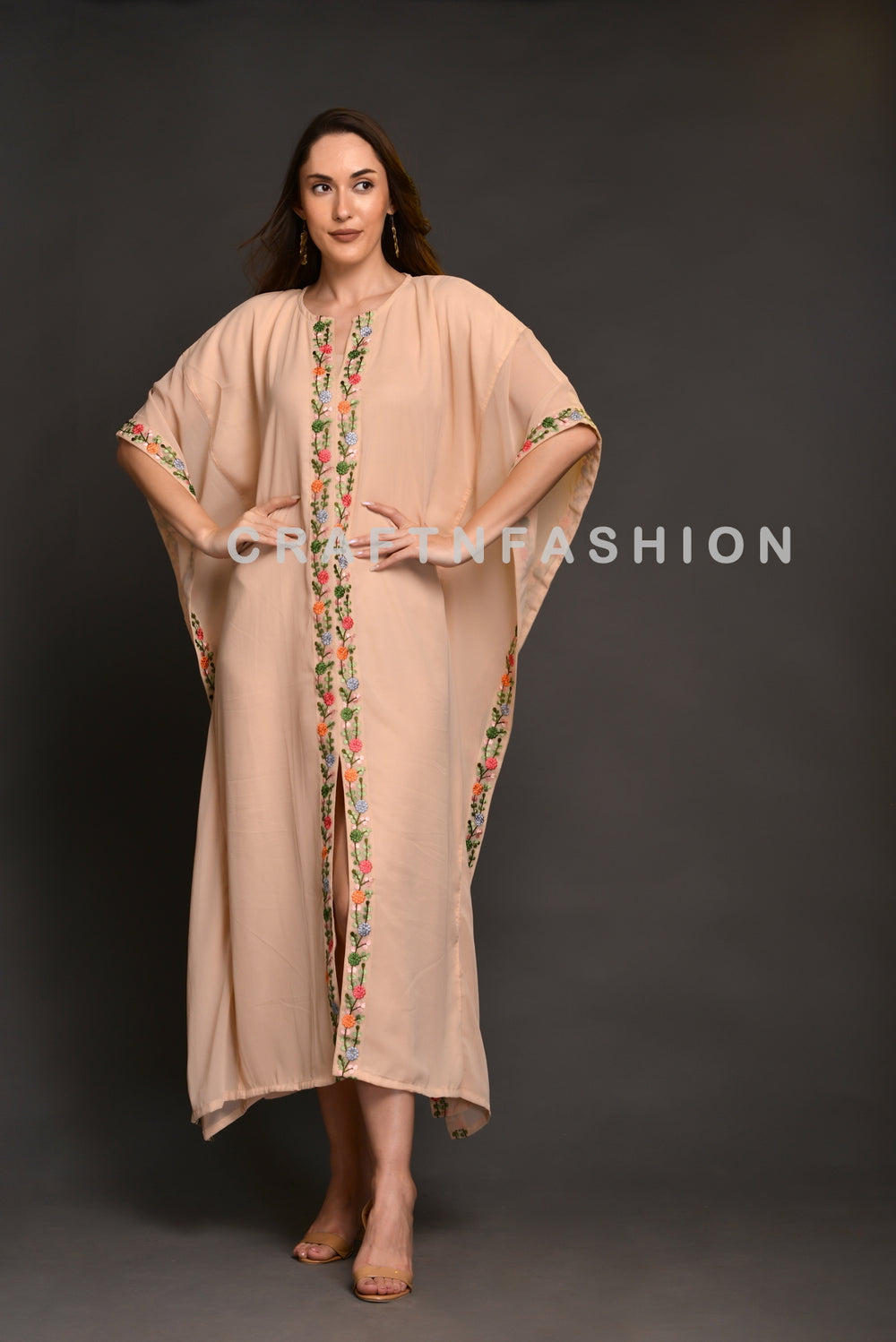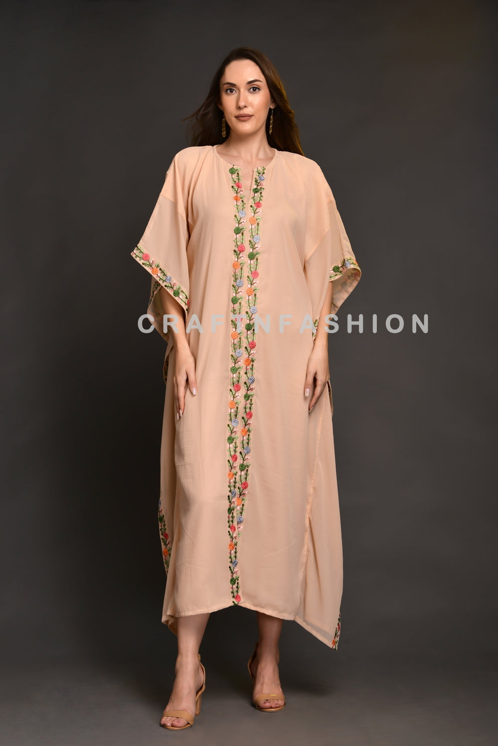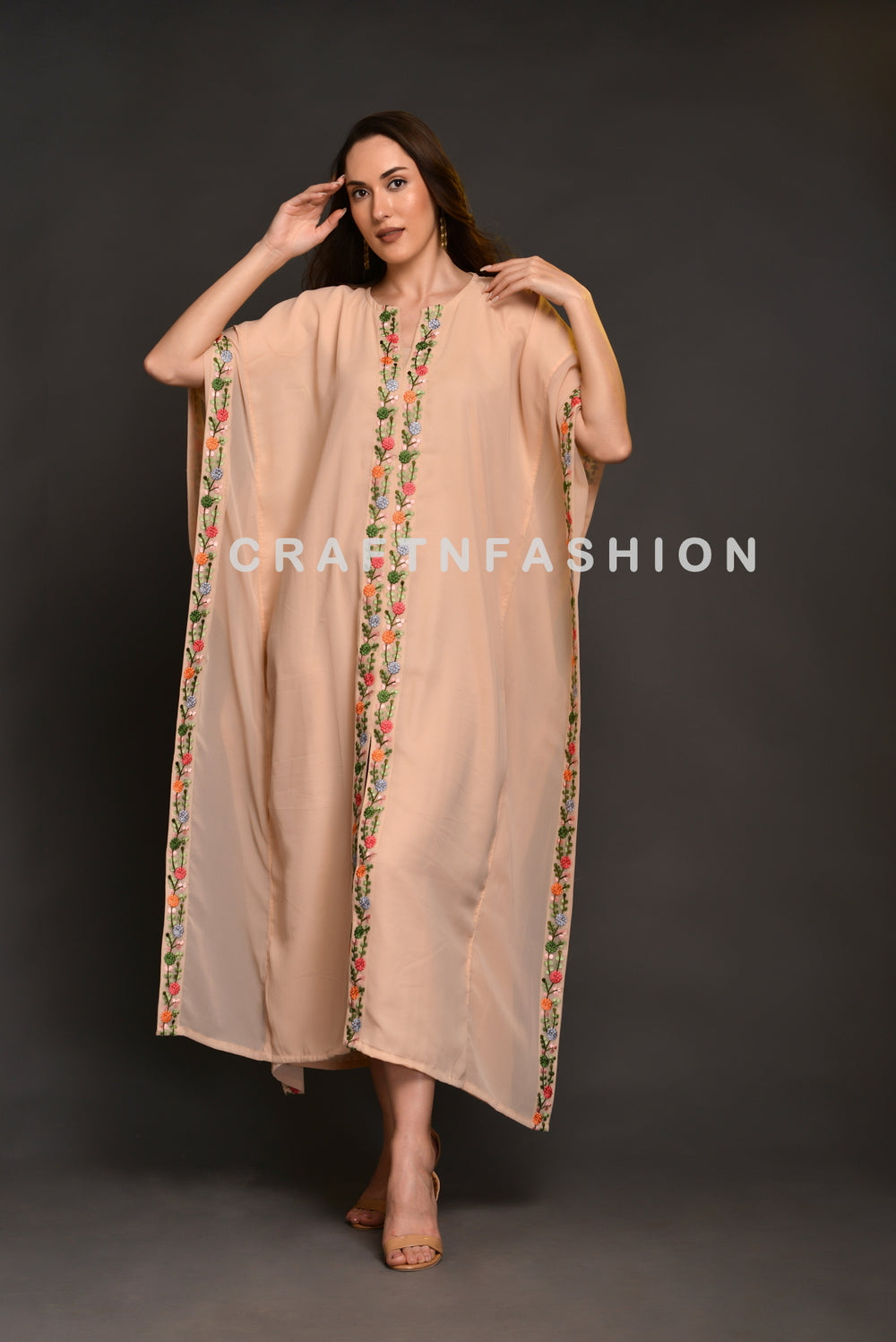 Designer Embroidered Lace Border Chiffon Kaftan Dress with front slit.