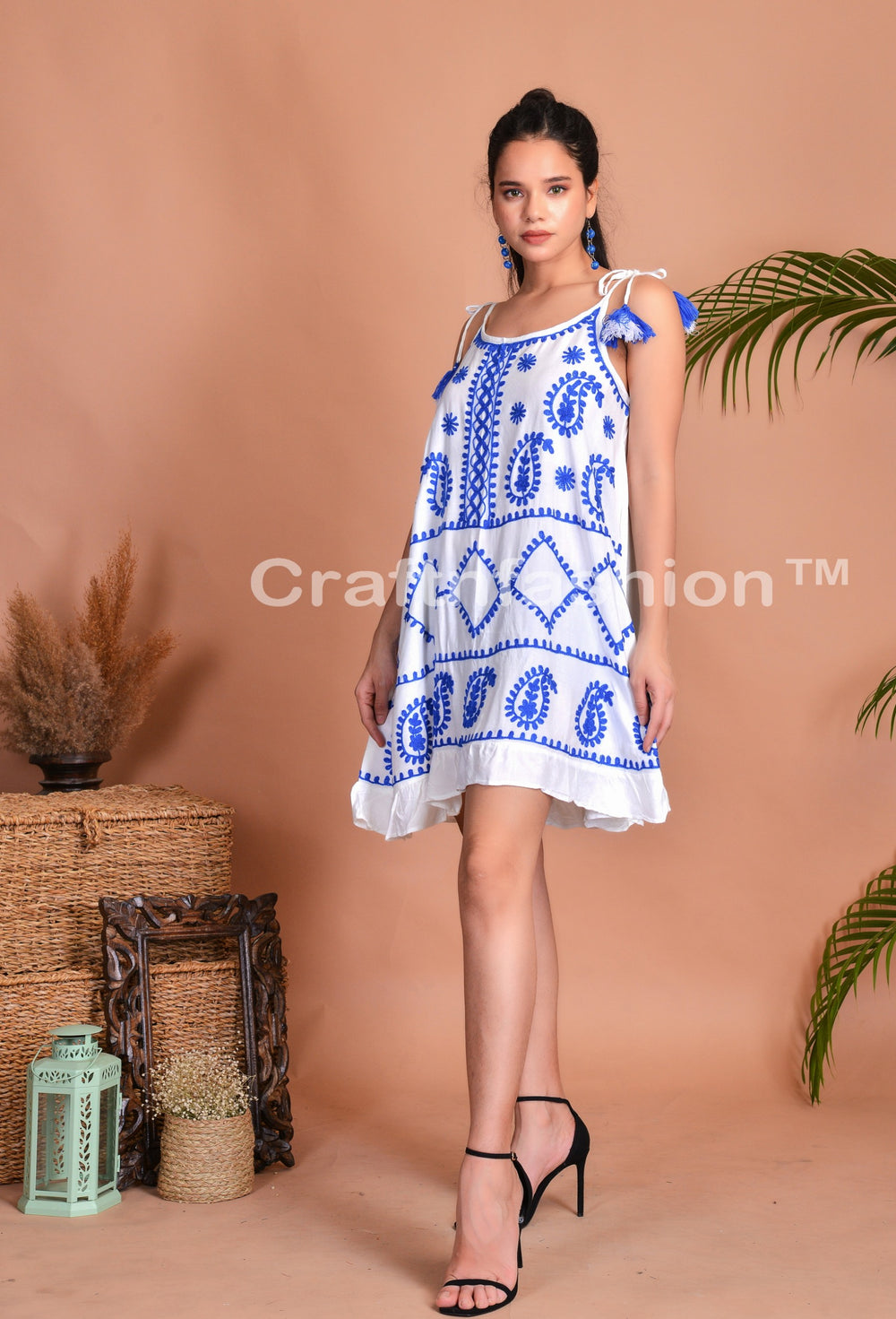 Robe midi brodée Beach Wear, mini-robe de style spaghetti avec broderie florale de créateur. La bandoulière ouverte est dotée de gros pompons en coton.