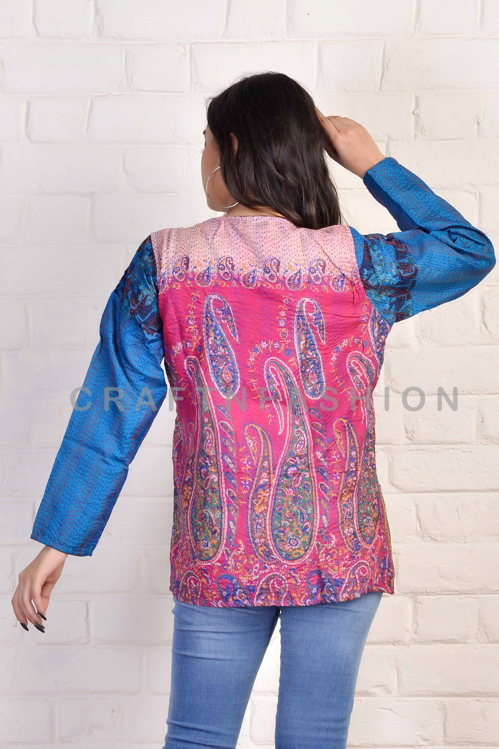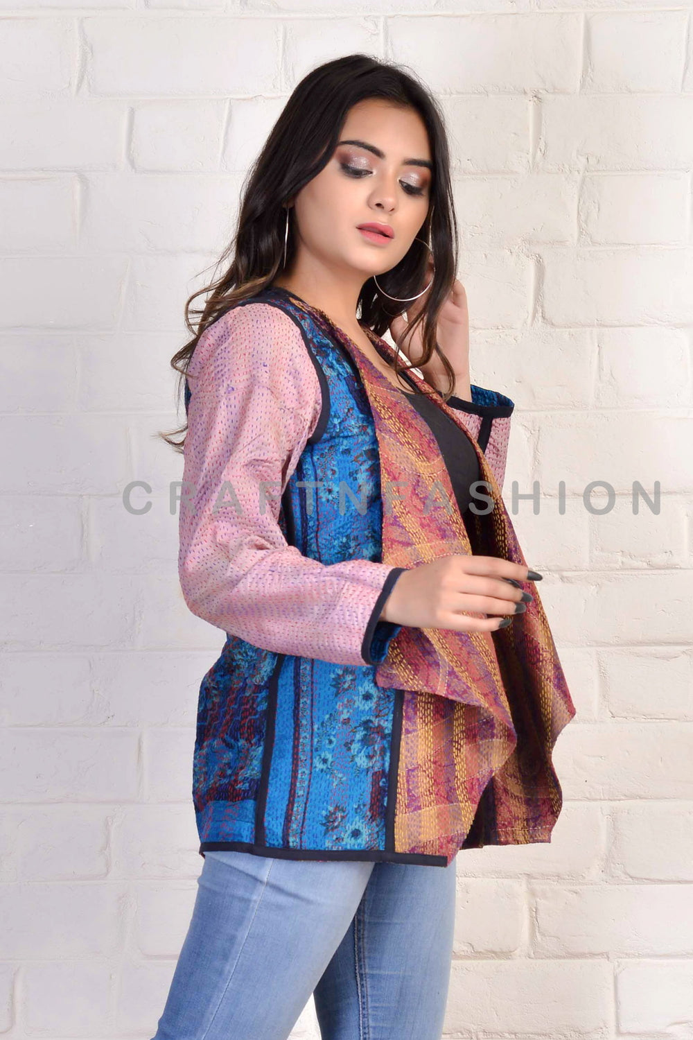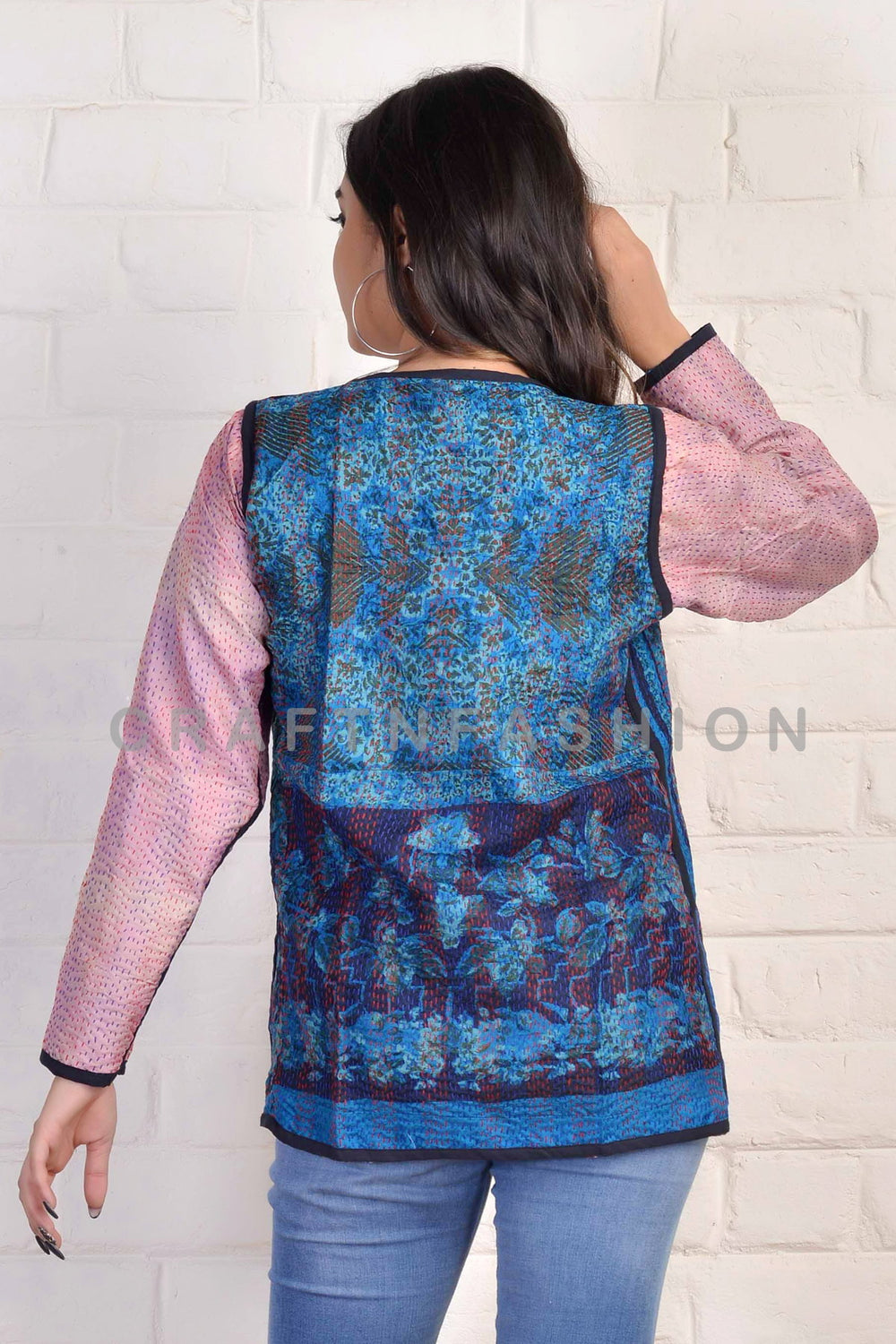 Designer indien Boho Kantha taille manteau haussement d'épaules. Manteau taille réversible élégant Kantha fabriqué à la main. Idéal pour les vêtements formels, les vêtements de tous les jours, la mode bohème, la veste bohème Kantha.