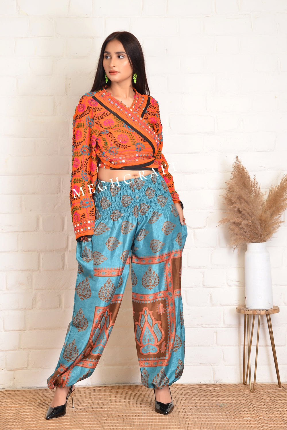 Pantalon smocké en soie recyclée vintage indienne avec poche.