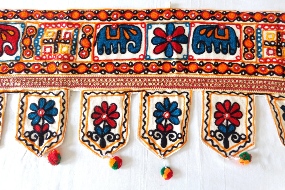 Une porte Rabari originale brodée à la main provenant des zones rurales de l'Inde. Ajoutez des couleurs indiennes à n'importe quelle pièce, mur, chevet, porte, avec cette cantonnière. Avec de belles couleurs et motifs, c'est une belle pièce pour aider à décorer une maison ou un studio de yoga. À utiliser dans votre maison bohème, votre chambre d'enfant ou votre temple et idéal pour les festivals et le camping