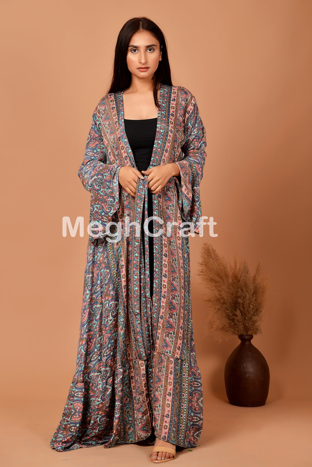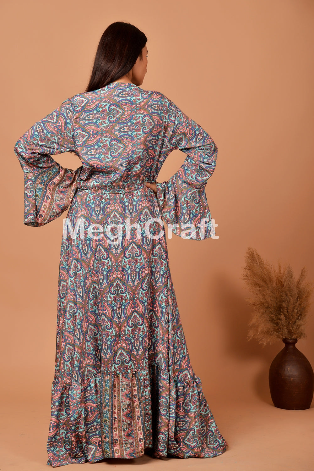 Robe kimono indienne vintage en soie recyclée Sari Wrap à manches cloche. Longue longueur, coupe ample, douce et confortable.