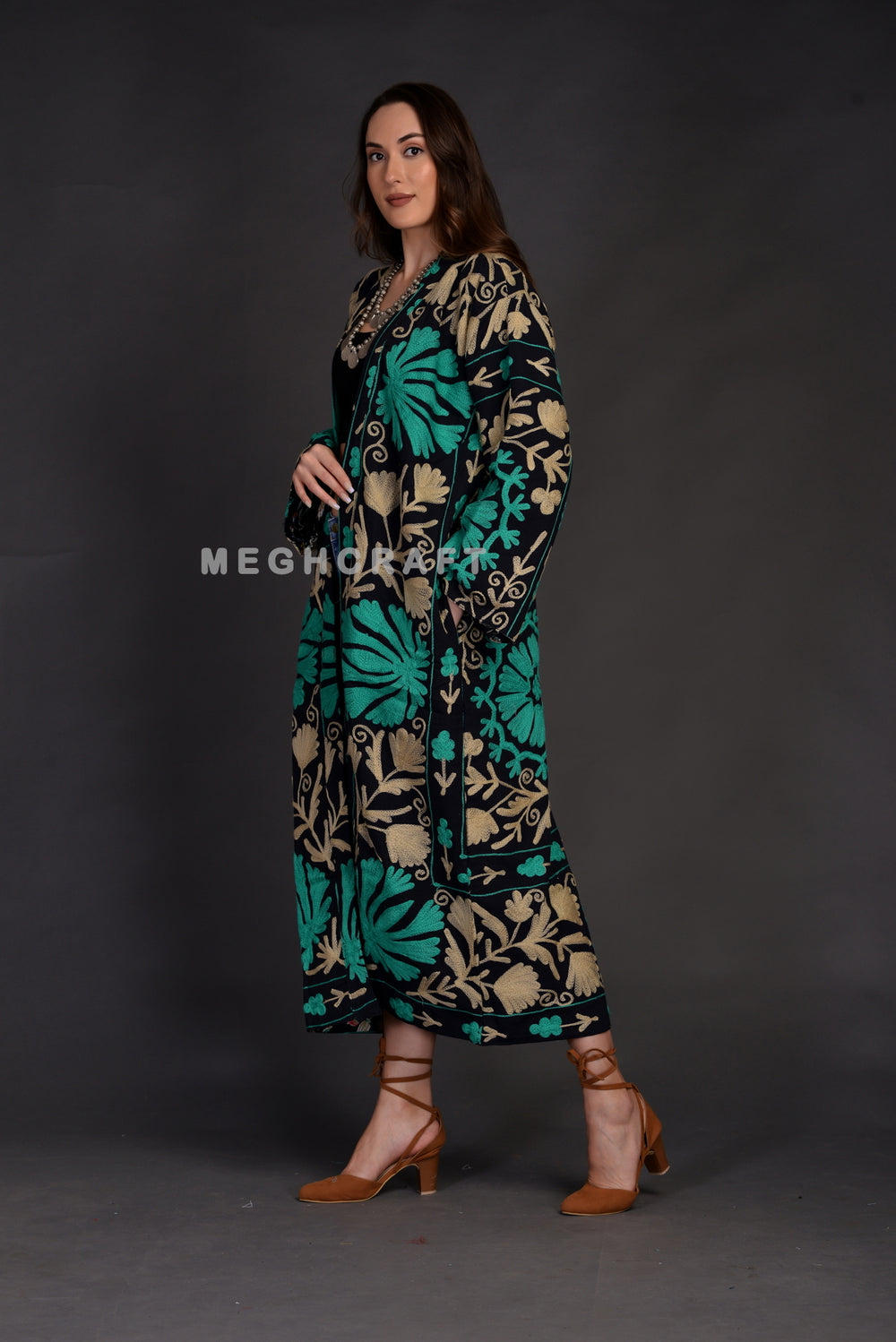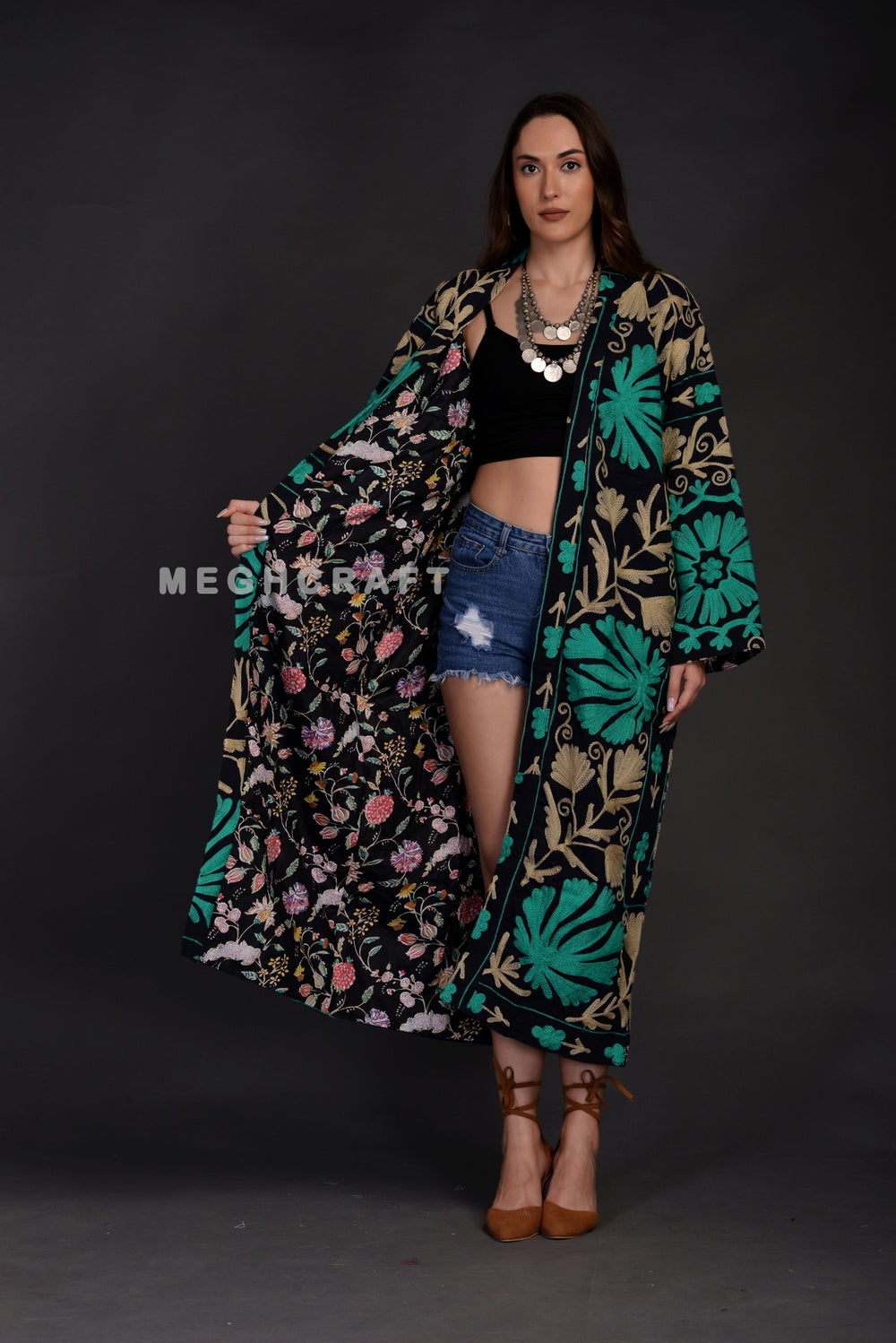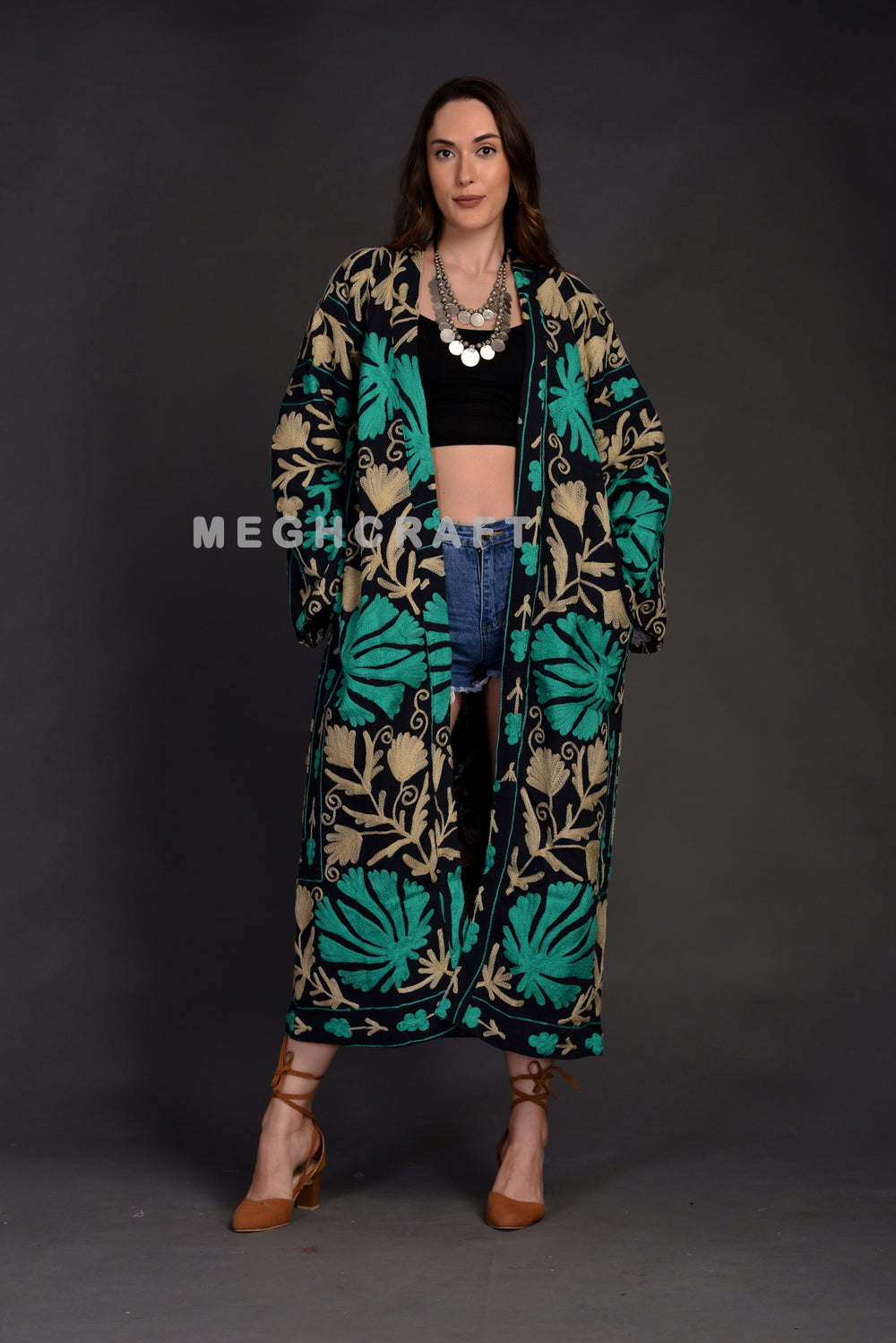 Indian Cotton Hand Woven Suzani Embroidered Long Jacket.