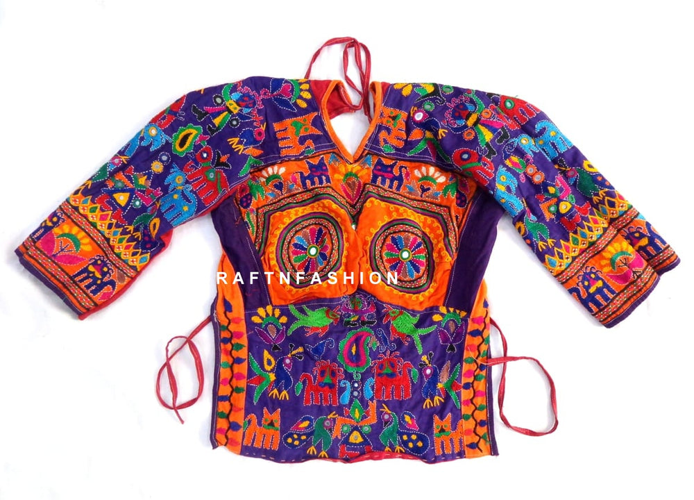 Chemisier Boho Gypsy, chemisier tribal Kutch, chemisier de travail tribal indien vintage fabriqué à la main Blouse dos nu Kapda agrémentée de broderie à la main et de travail miroir. Il s’agit d’un chemisier dos nu brodé vintage bien conservé de collection.