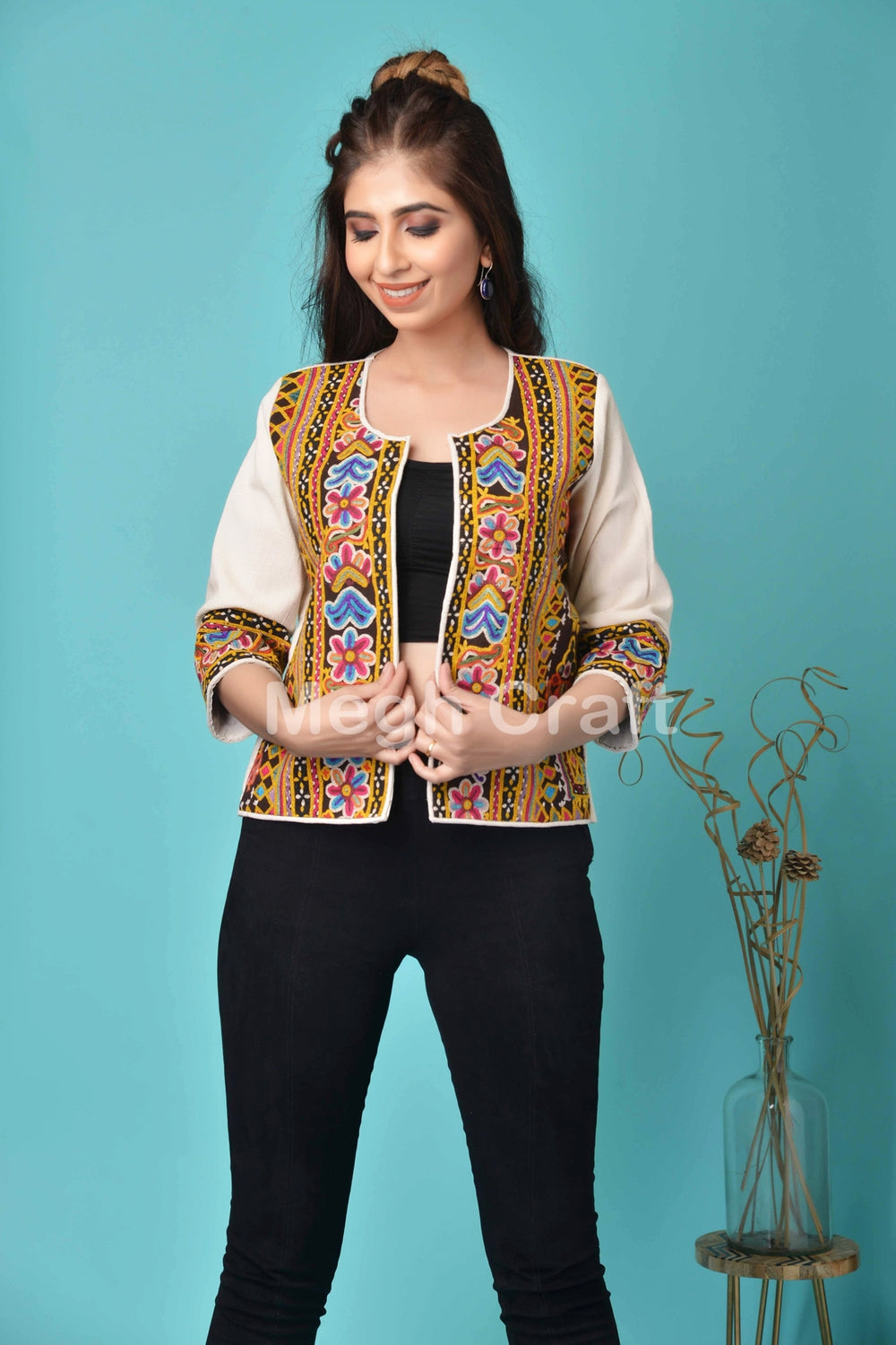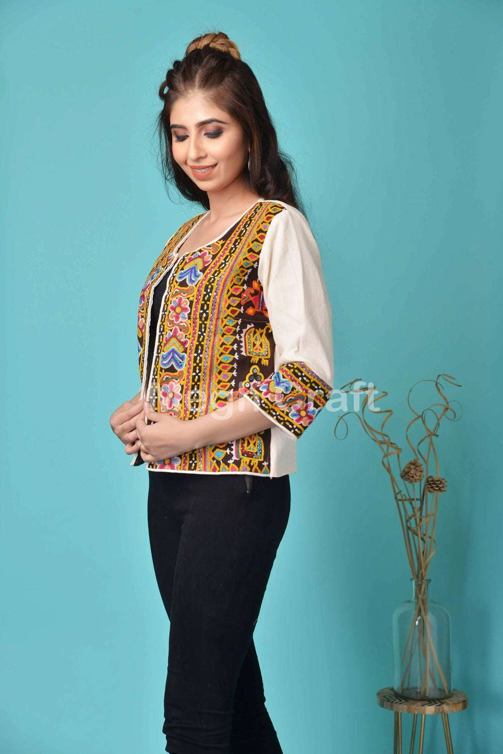 Séquence de broderie à la main Veste de travail Sitara Tikki fabriquée par un artisan indien gujarati qualifié ayant à la fois le travail de broderie latérale avec un look brillant et accrocheur