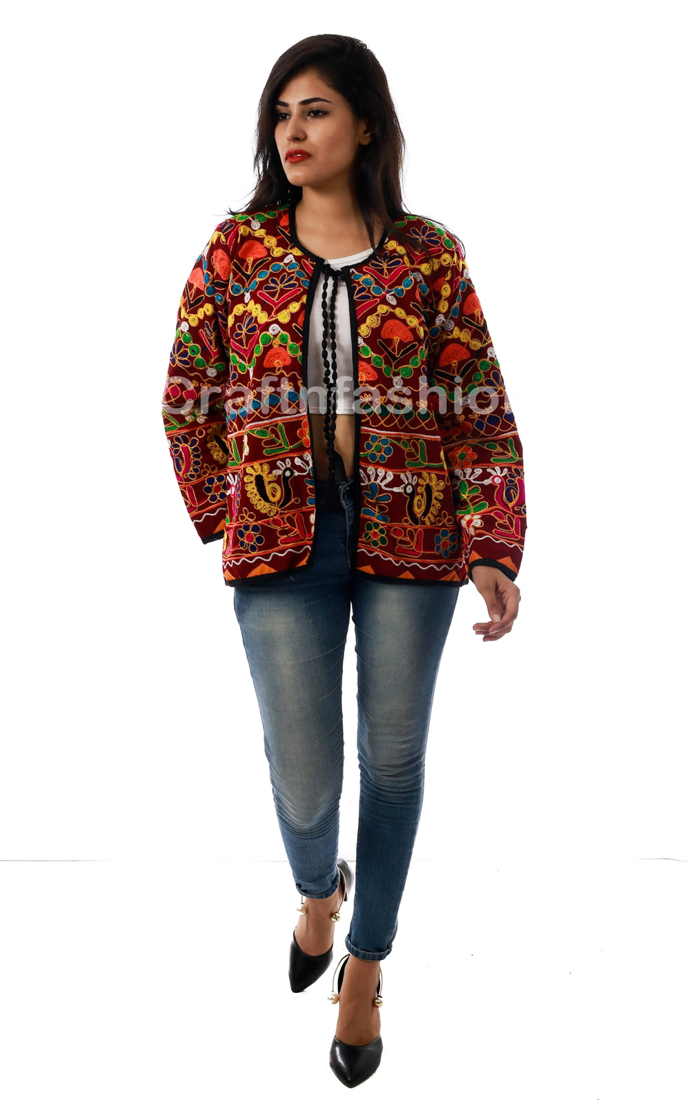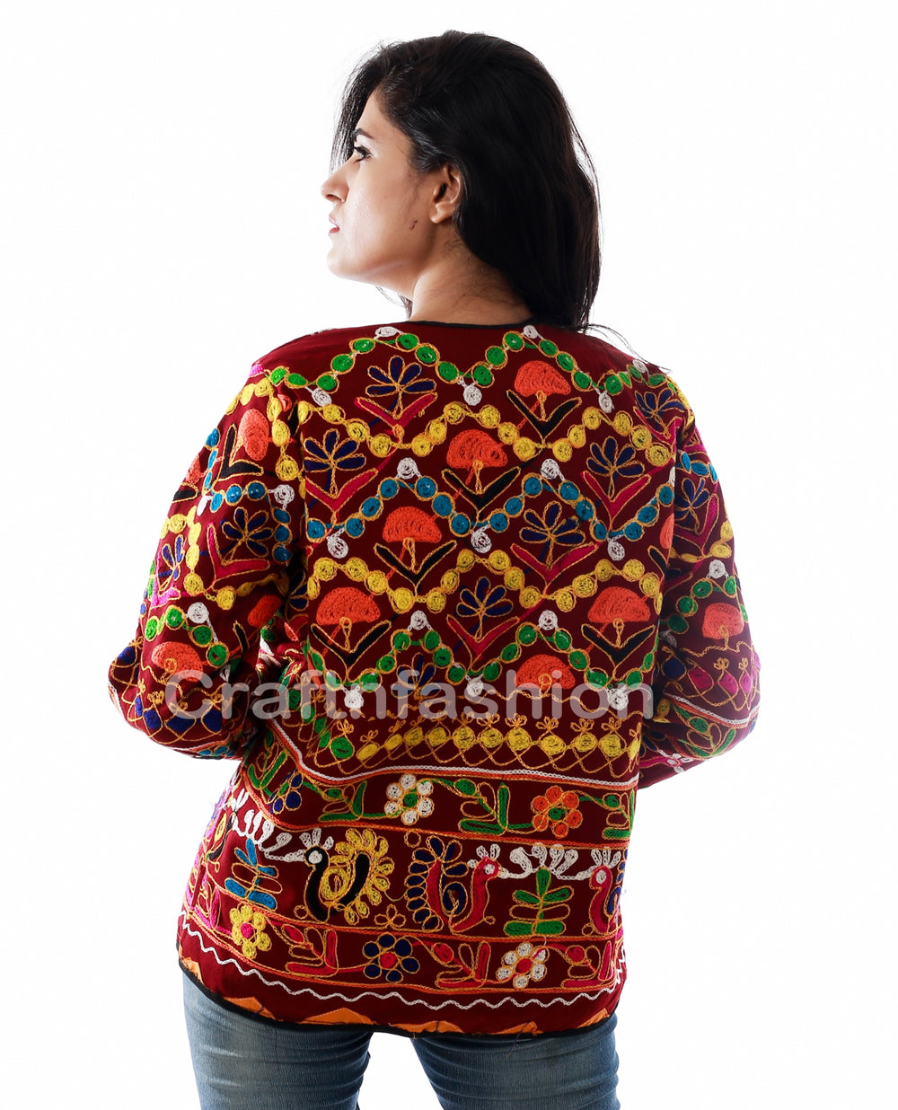 Veste de travail indienne en miroir brodée à la main fabriquée par un artisan indien gujarati qualifié ayant à la fois le travail de broderie latérale avec un look brillant et accrocheur.