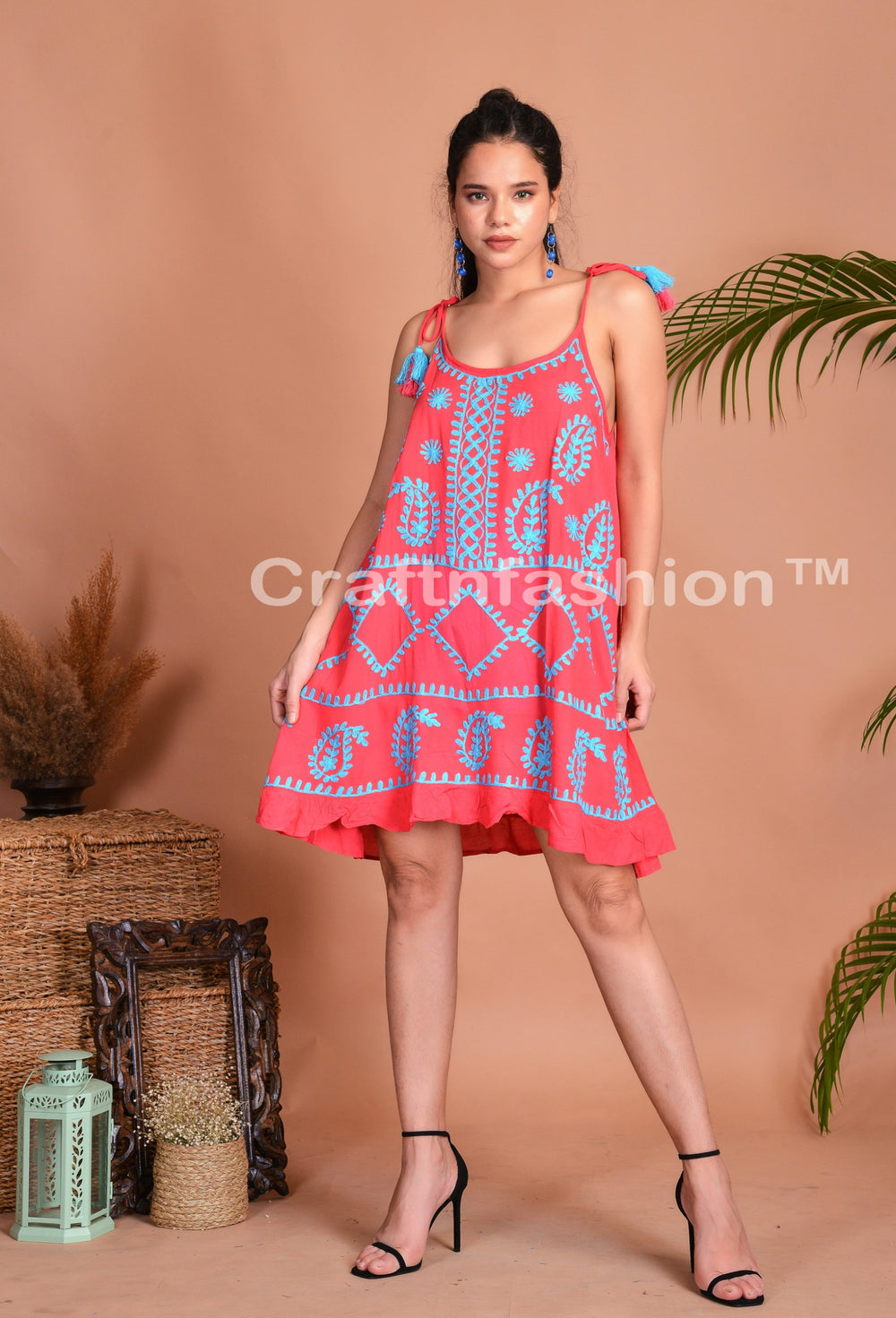 Mini robe brodée Bohemian Beach Wear, mini robe de style spaghetti avec broderie florale de créateur. La bandoulière ouvrable est dotée de gros pompons en coton.