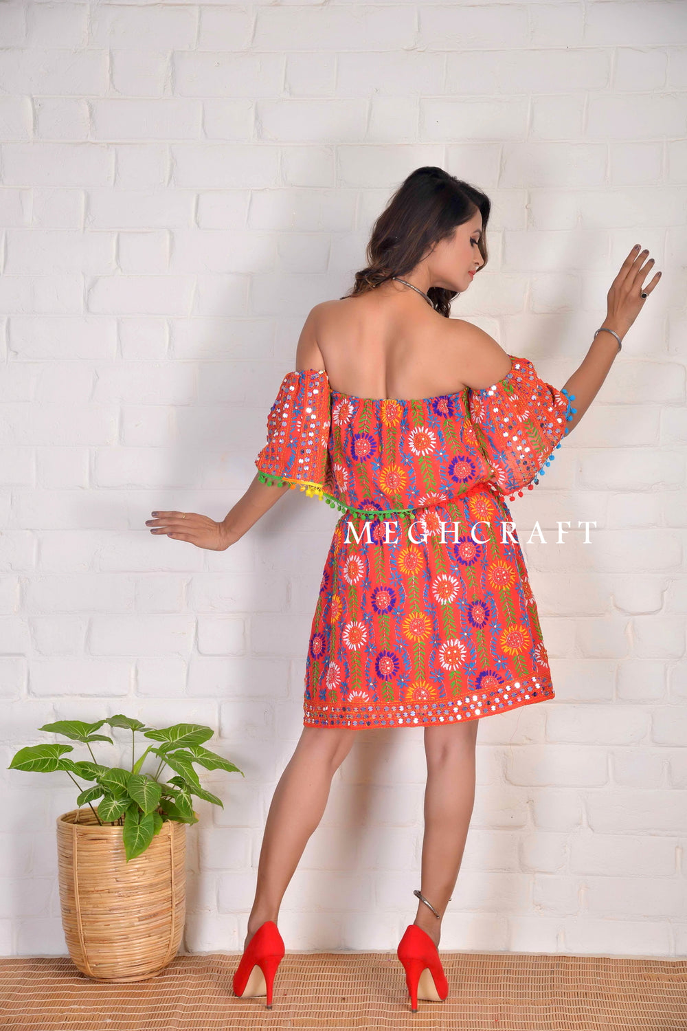 Haut court tube à épaules dénudées coloré brodé à la main indien de créateur avec jupe.