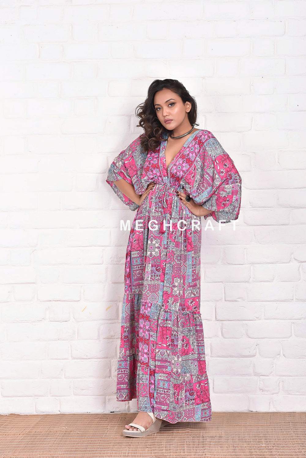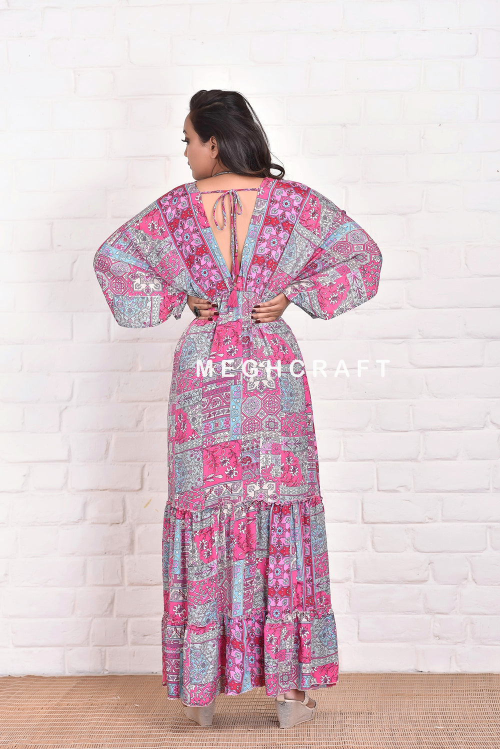 Dernière robe longue de créateur de mode d'été bohème à col en V. Idéal pour la mode estivale, le style bohème, les vêtements de plage, les costumes de danse et le style de la mode urbaine. Fabriqué exclusivement en Inde.