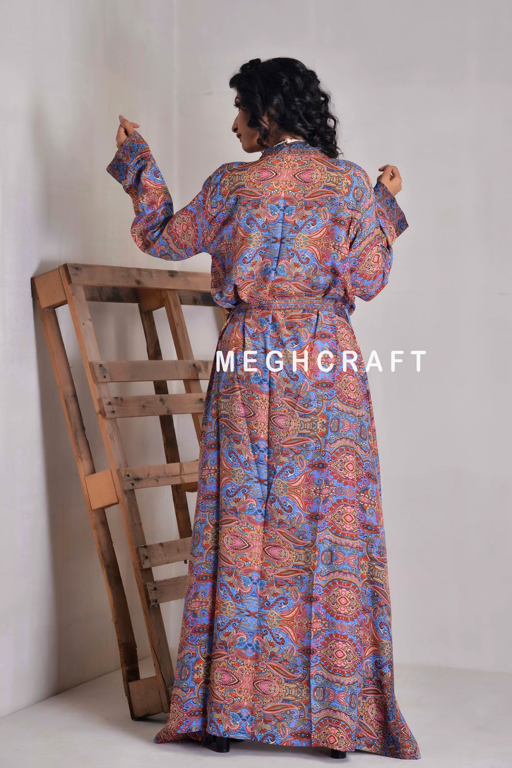 Robe kimono en soie crêpe poly bohème avec ceinture. Coupe longue, ample, douce et confortable. Idéal comme vêtements de plage, bikini, maillot de bain, peignoir, cardigan d'été, vêtements de nuit et vêtements de villégiature.