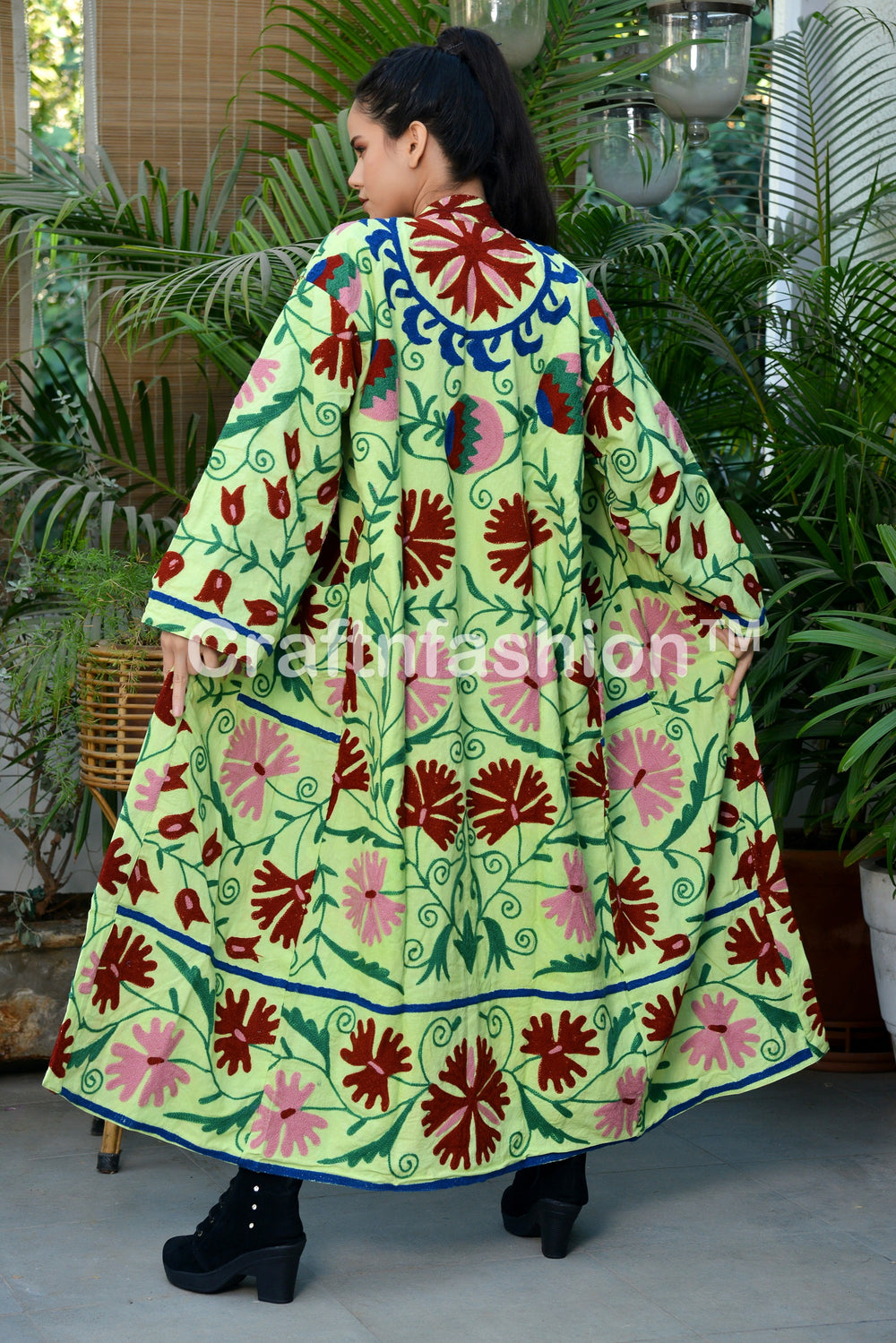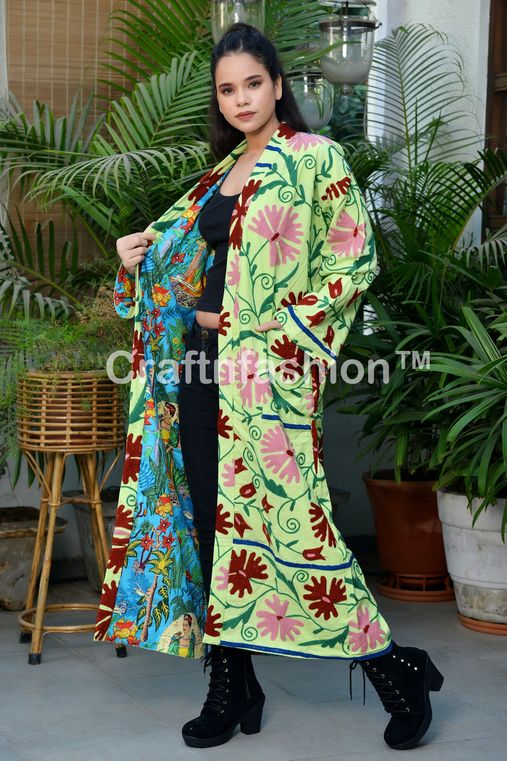 Floral, Paisley, Vector Thread Embroidery Suzani Kimono Coat Jacket Crafted By Skilled Indian Artisan Having both the Side Embroidery Work with Bright & Eye catchy Look. The Traditional embroidery patterns will make you look Trendy & beautiful.