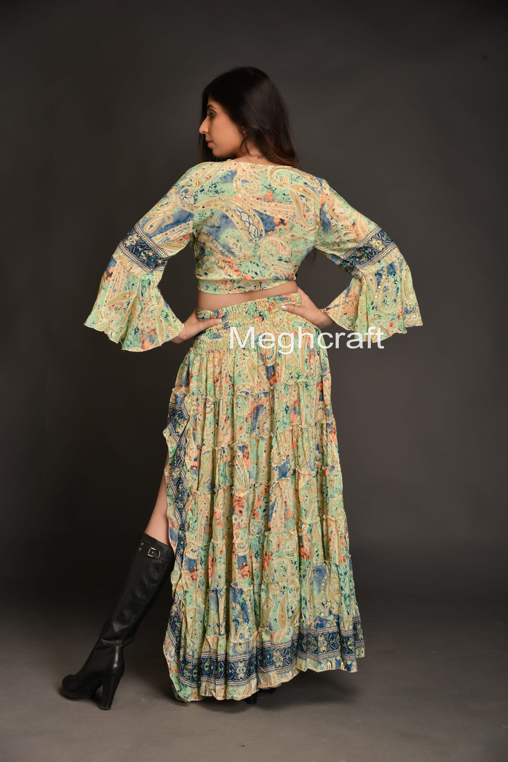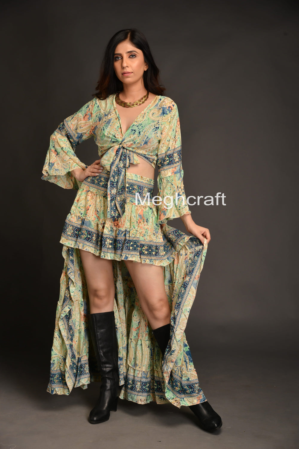 Summer Wear Boho Fashion High Low Skirt with Bell Sleeve Tie Style Top / Blouse clothing set for women.