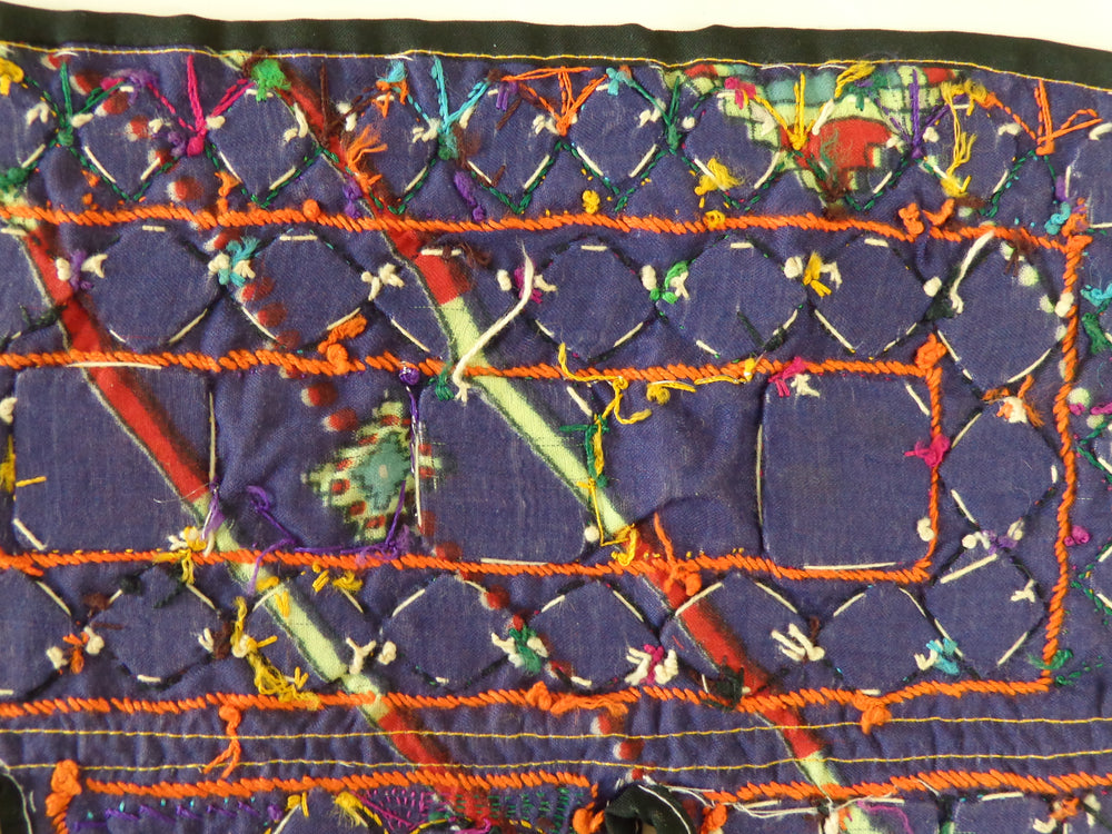 This Antique Banjara Gypsy bohemian or "Indian vintage” sturdy cotton hand embroidered toran (Door hanging) from Kutch Gujarat. The interplay of geometric forms with vibrant colors in a simple, unpretentious. A "Tribal" design is classic style which effective in conveying the adoration that went into it's creation. It is designed to hang above a door or window, however, it would be equally suitable as a footer on the end of a bed or one the back of a sofa or as a table runner. Heck, wrap it around your body and wear it as retro-ethnic.Created by the skilled tribal woman of Gujarat