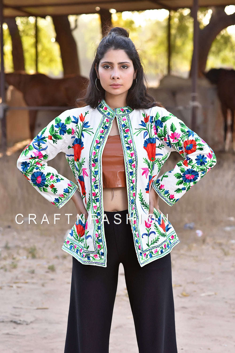 Floral, Paisley, Vector Thread Embroidery Suzani Kimono Coat Jacket Crafted By Skilled Indian Artisan Having both the Side Embroidery Work with Bright & Eye catchy Look. The Traditional embroidery patterns will make you look Trendy & beautiful.