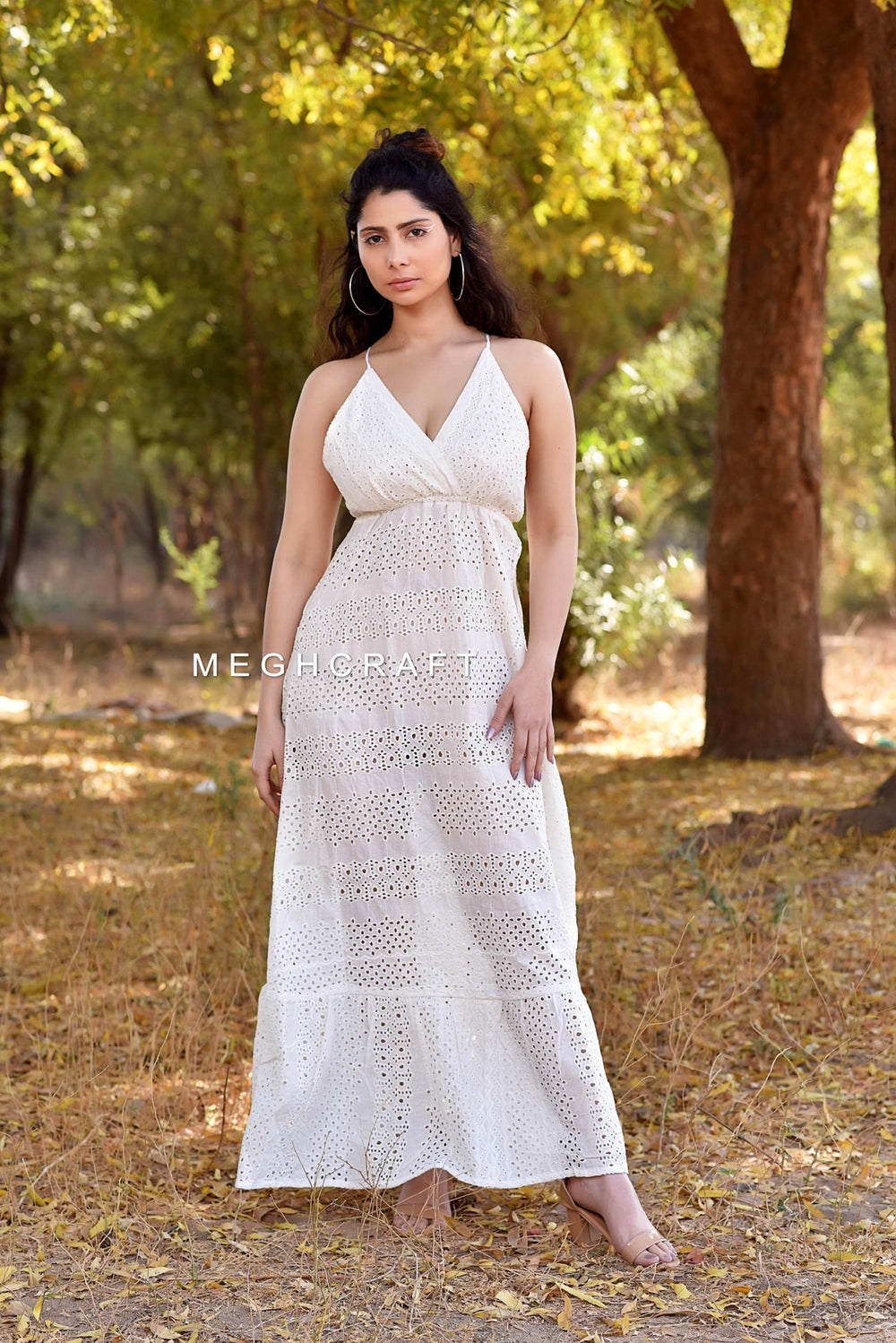 Designer Schiffli Embroidered Cutwork Midi Dress. Best Suitable for summer wear ,beach wear ,wedding wear, bridesmaid's dresses & fashion wear.