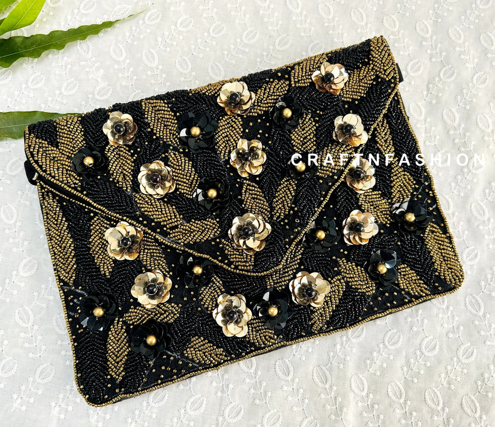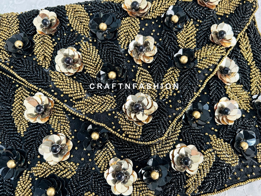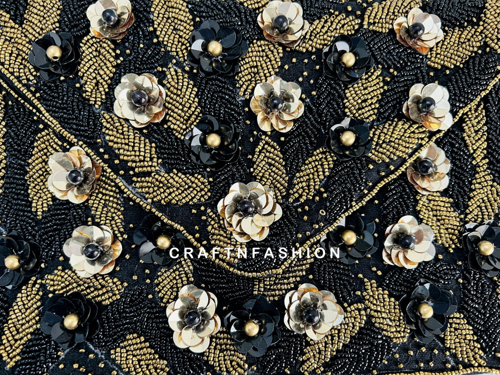 Black Floral Jute Boho Clutch Bag, Exclusive Boho Fashion Jute Clutch Handbag. This is an authentic Hand embroidered, Beaded Clutch with chain crossbody strap.
