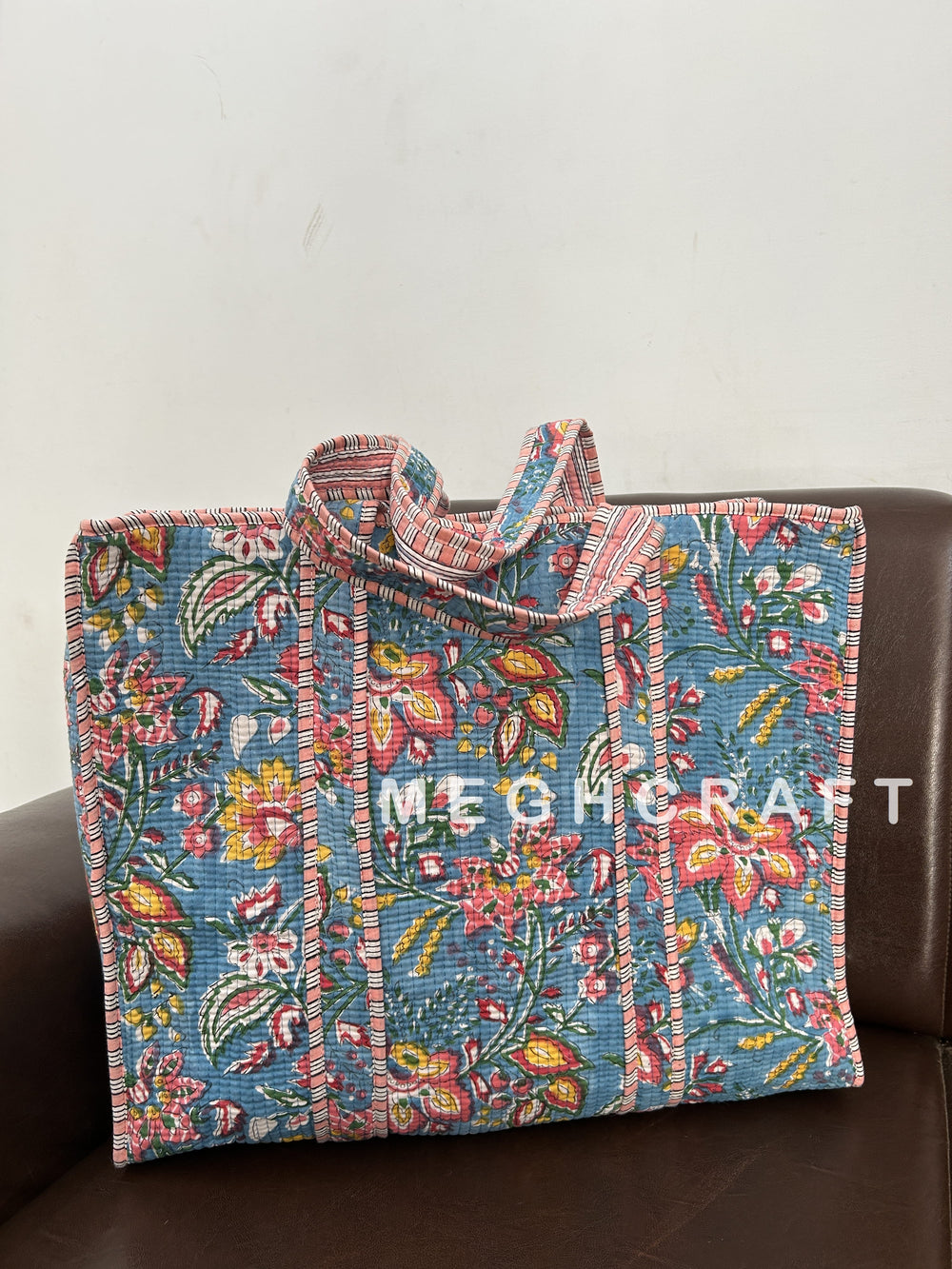 Cotton Quilted Tote bag is Perfect for a market tote, beach bag, weekender Bag, Shopping bags and much more! Handcrafted Indian cotton block-printed quilted tote bag with Zip closure, perfect for shopping, travel, or daily use. Features traditional patterns, durable and comfortable shoulder straps. Indian cotton, block print, quilted tote bag, shopping bag, shoulder bag, handcrafted, eco-friendly, traditional patterns, lightweight, spacious, reusable, artisanal, fair trade, sustainable.