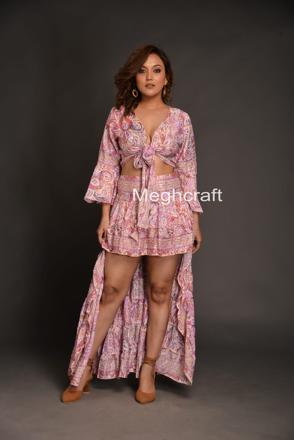 Summer Wear Boho Fashion Silk High Low Skirt with Bell Sleeve Tie Style Top / Blouse clothing set.
