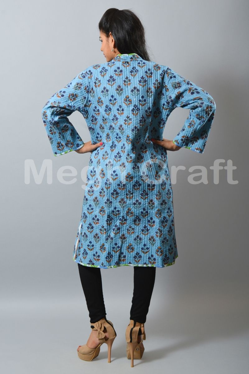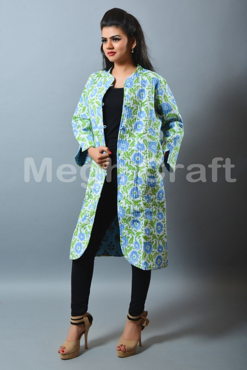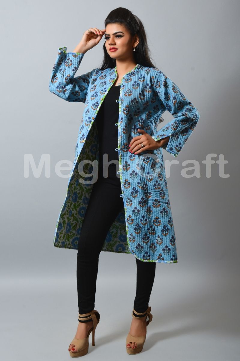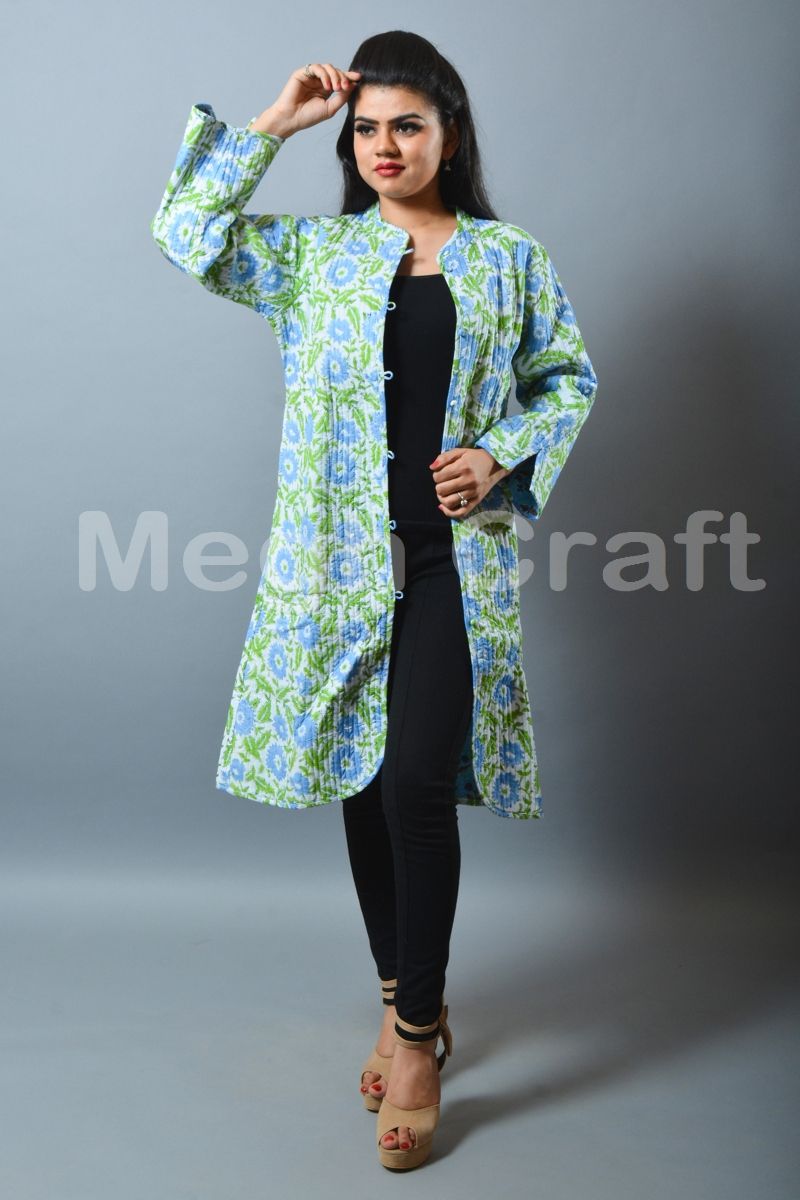 Indian Cotton Blocked Printed Handmade Reversible Quilted Jacket ,Long.
