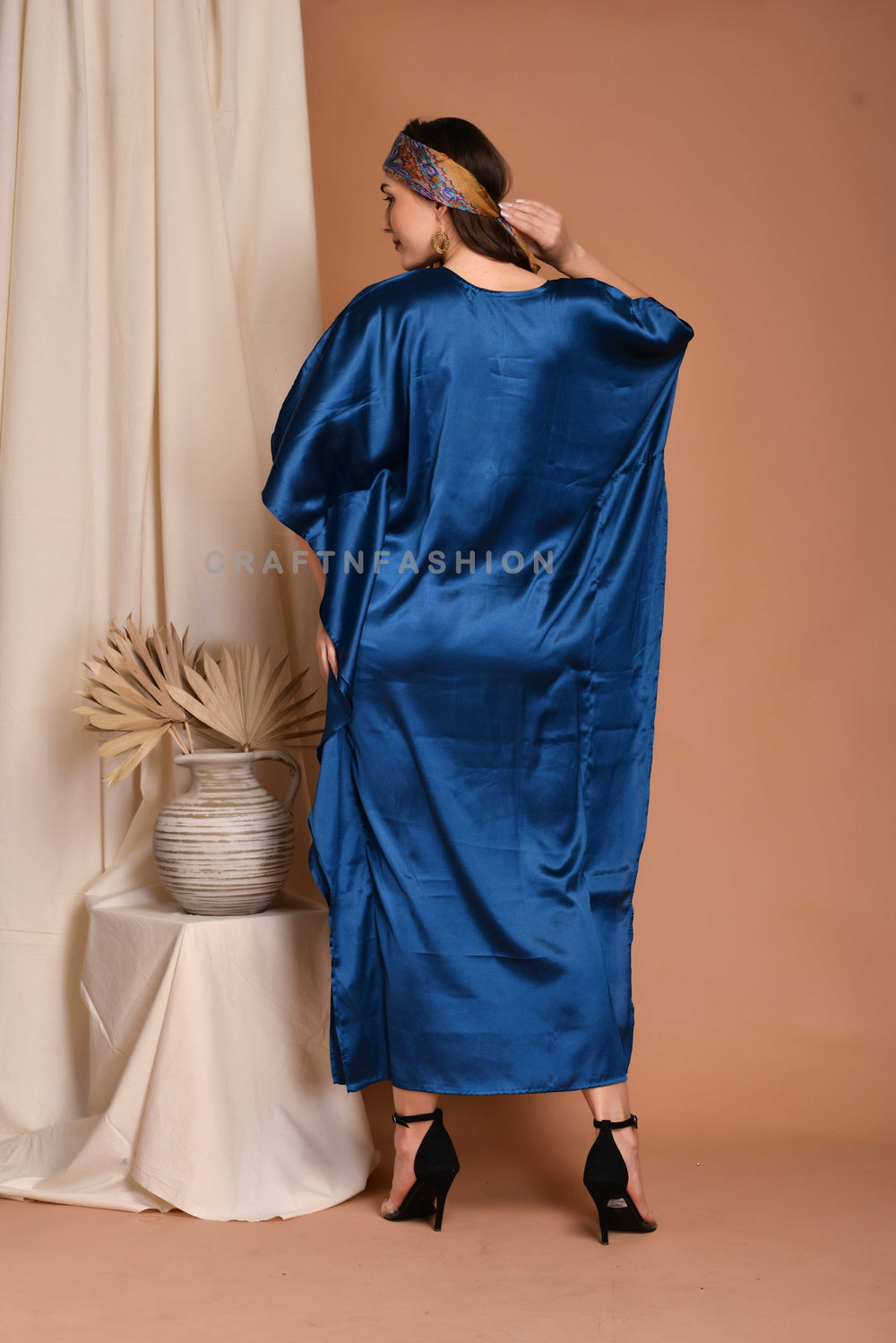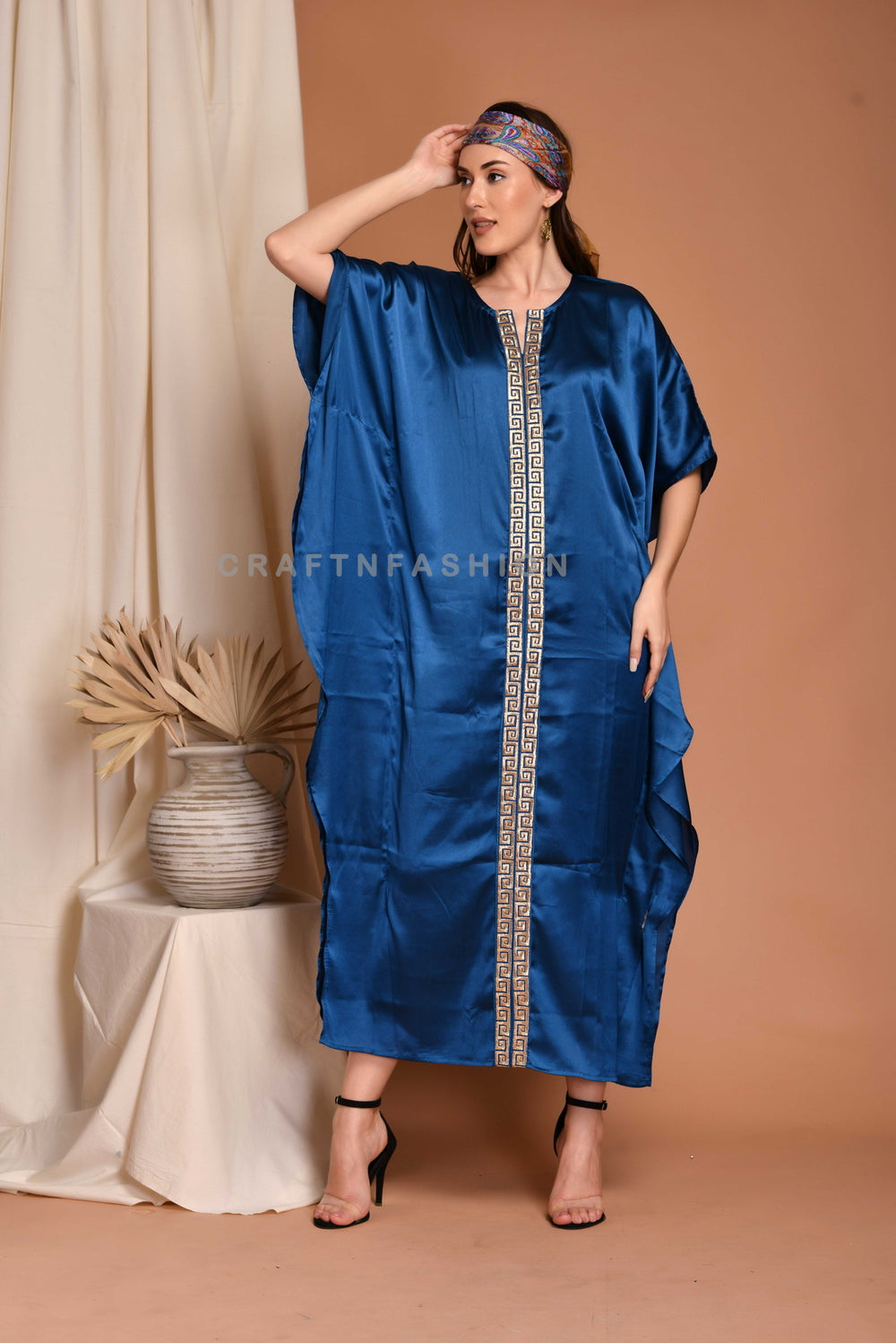 Boho Fashion Satin kaftan Dress. Thread Work Border Boho Style Beach wear Kaftan Dress. Best Suitable for Beach Wear, Fusion Wear, Fashion Wear, Traditional Wear
