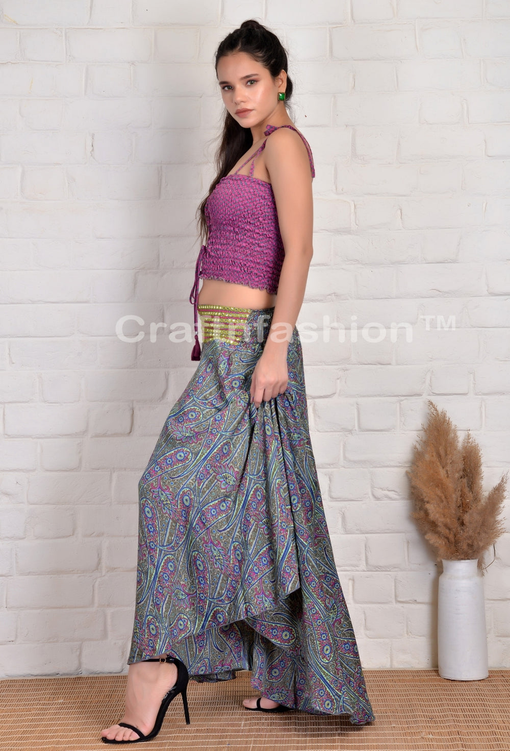 Bohemian Fashion Silk Wide Leg Trouser / Palazzo Pant With Embellished Embroidered Work on Front Waist Side, Back side Smocked Elastic Free Size Adjustable.