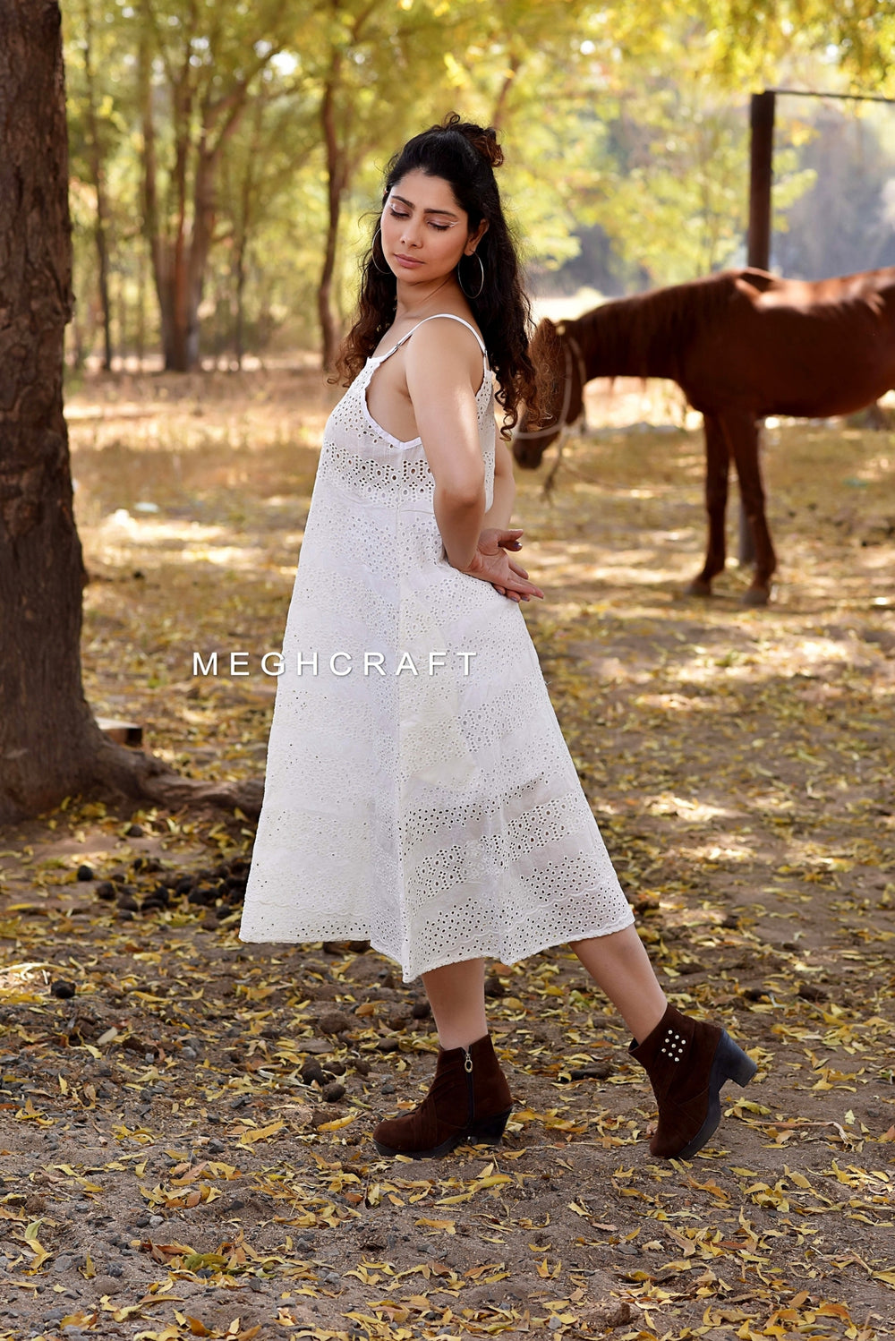 Designer Schiffli Embroidered Cutwork Midi Dress. Best Suitable for summer wear ,beach wear ,wedding wear, bridesmaid's dresses & fashion wear.