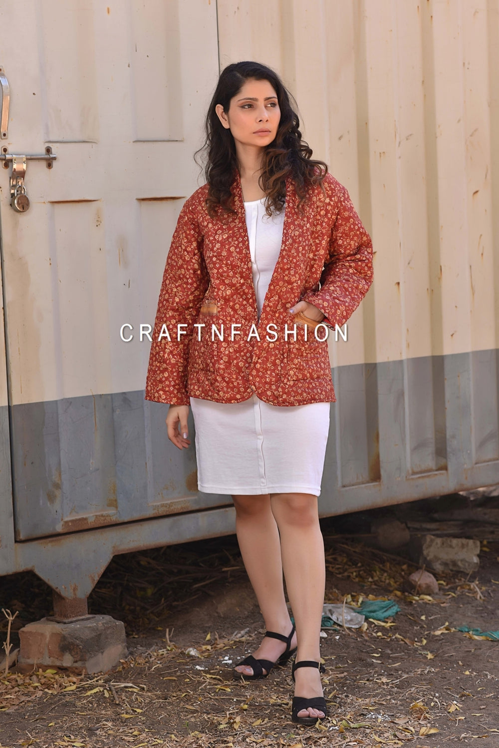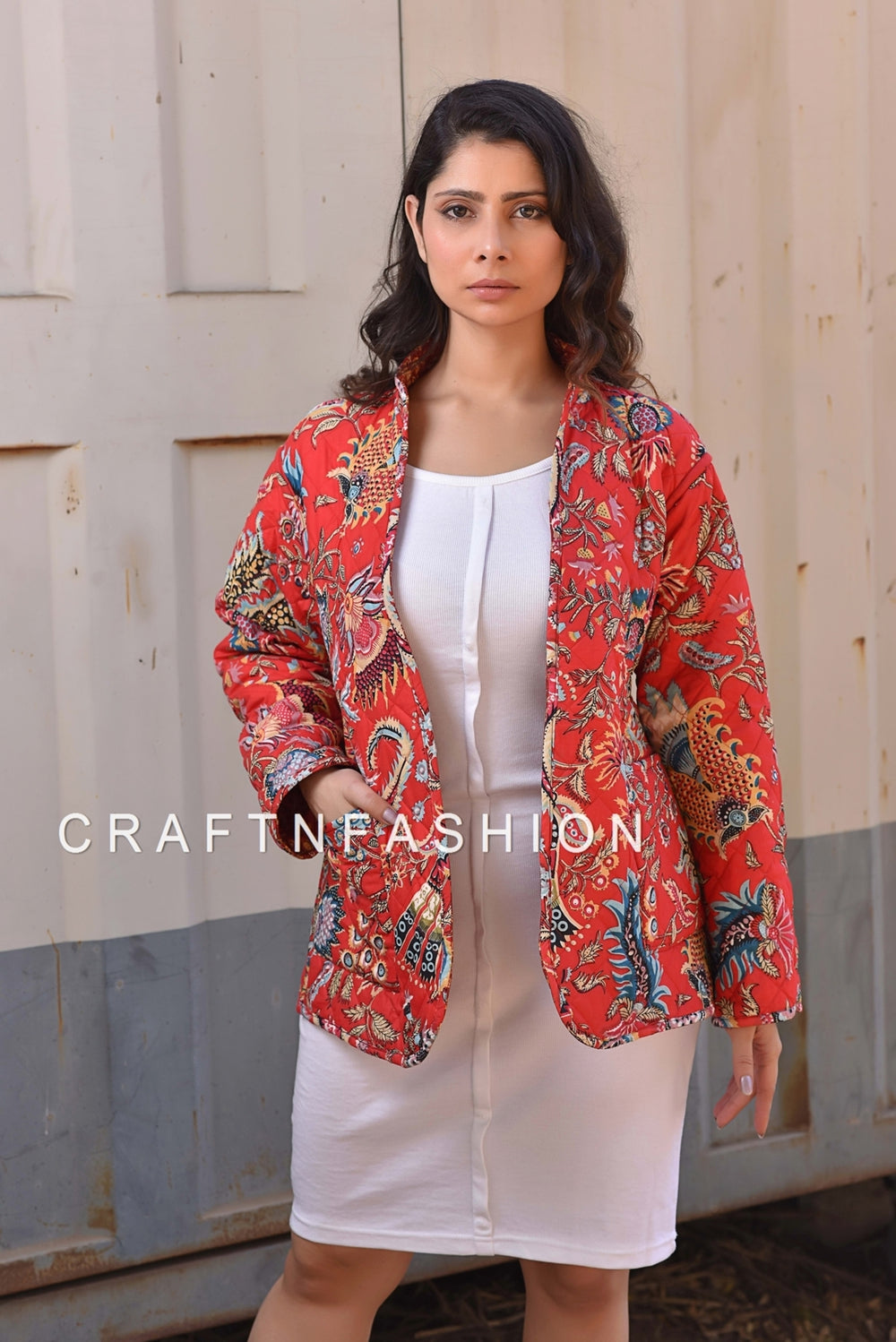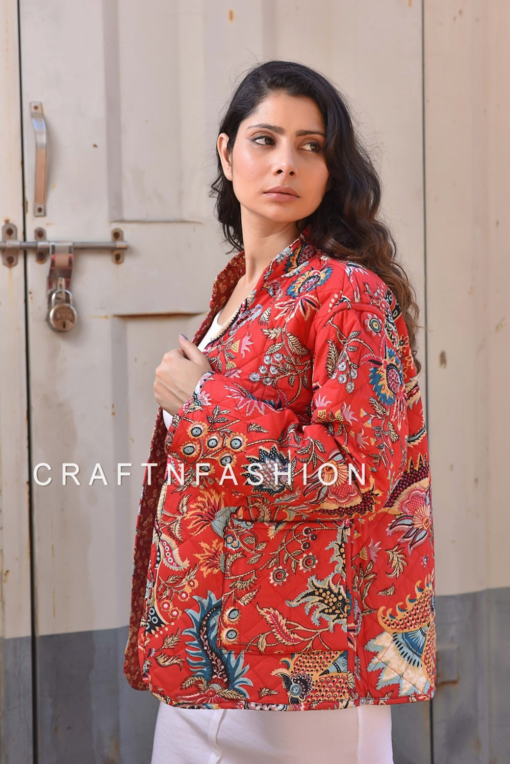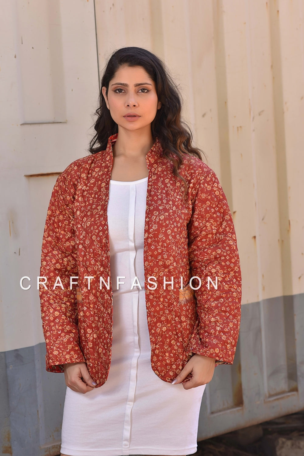 Indian Floral Design Quilted Reversible Silk jacket with cotton block printed lining - kimono jacket.