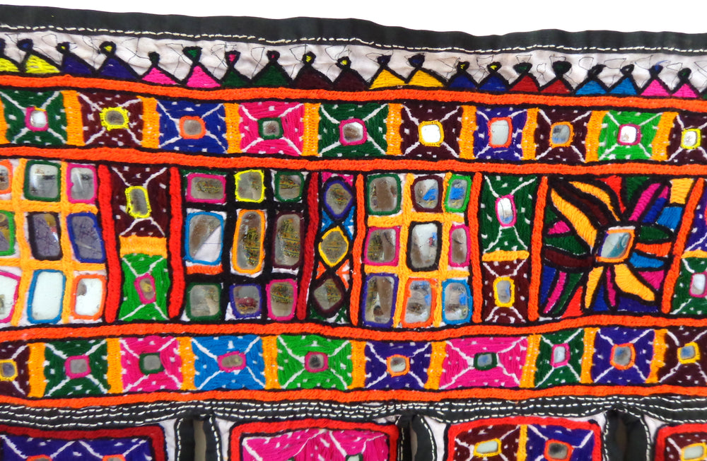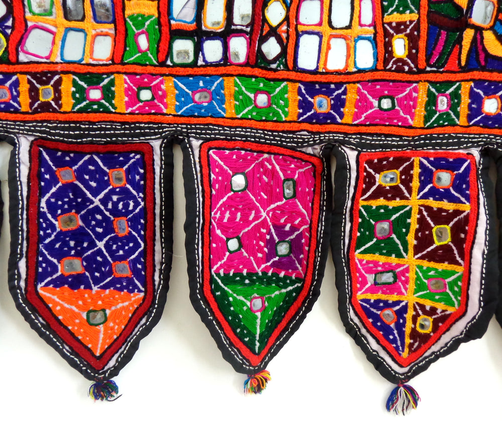 This Antique Banjara Gypsy bohemian or "Indian vintage” sturdy cotton hand embroidered toran (Door hanging) from Kutch Gujarat. The interplay of geometric forms with vibrant colors in a simple, unpretentious. A "Tribal" design is classic style which effective in conveying the adoration that went into it's creation. It is designed to hang above a door or window, however, it would be equally suitable as a footer on the end of a bed or one the back of a sofa or as a table runner. Heck, wrap it around your body and wear it as retro-ethnic.Created by the skilled tribal woman of Gujarat