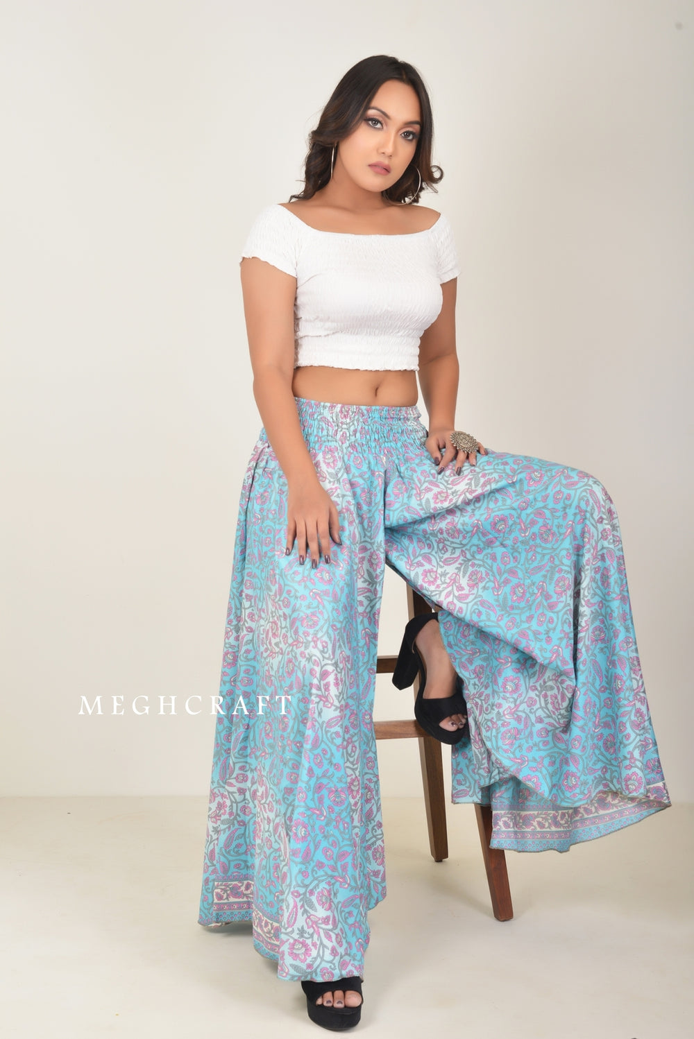 This Trousers are made of Vintae Recyle Silk Sari Fabric with Elasticated Waist Which makes it more flexible and Free size for any kind of Waist. Best suitable for Everyday Wear, Casual Wear, Yoga Wear, Boho Fashion Wear, Dance Wear Beach wear , Resort and Lounge wear.