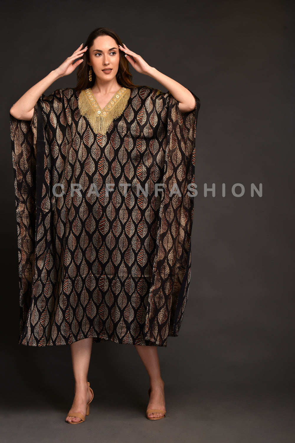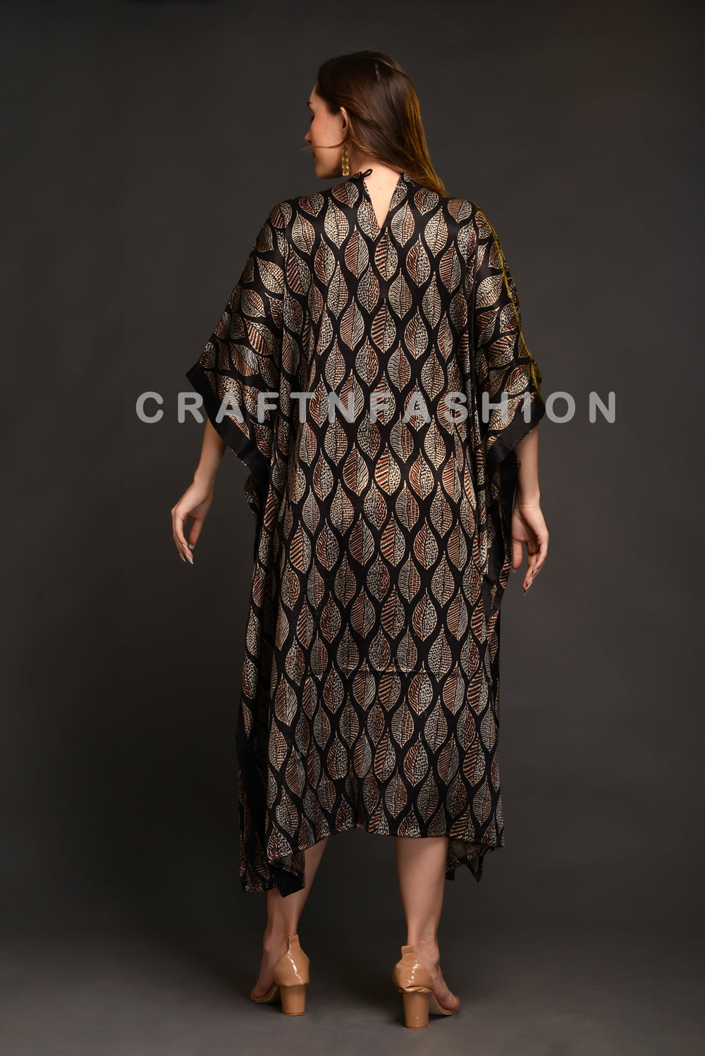 Designer mashru Silk Ajrakh Kaftan Style Beaded Neck Yoke Dress