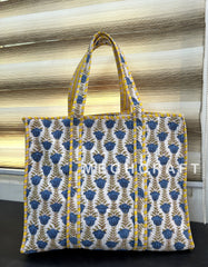 Perfect for a market tote, beach bag, weekender Bag, Shopping bags and much more! Handcrafted Indian cotton block-printed quilted tote bag with Zip closure, perfect for shopping, travel, or daily use. Features traditional patterns, durable and comfortable shoulder straps. Indian cotton, block print, quilted tote bag, shopping bag, shoulder bag, handcrafted, eco-friendly, traditional patterns, lightweight, spacious, reusable, artisanal, fair trade, sustainable.