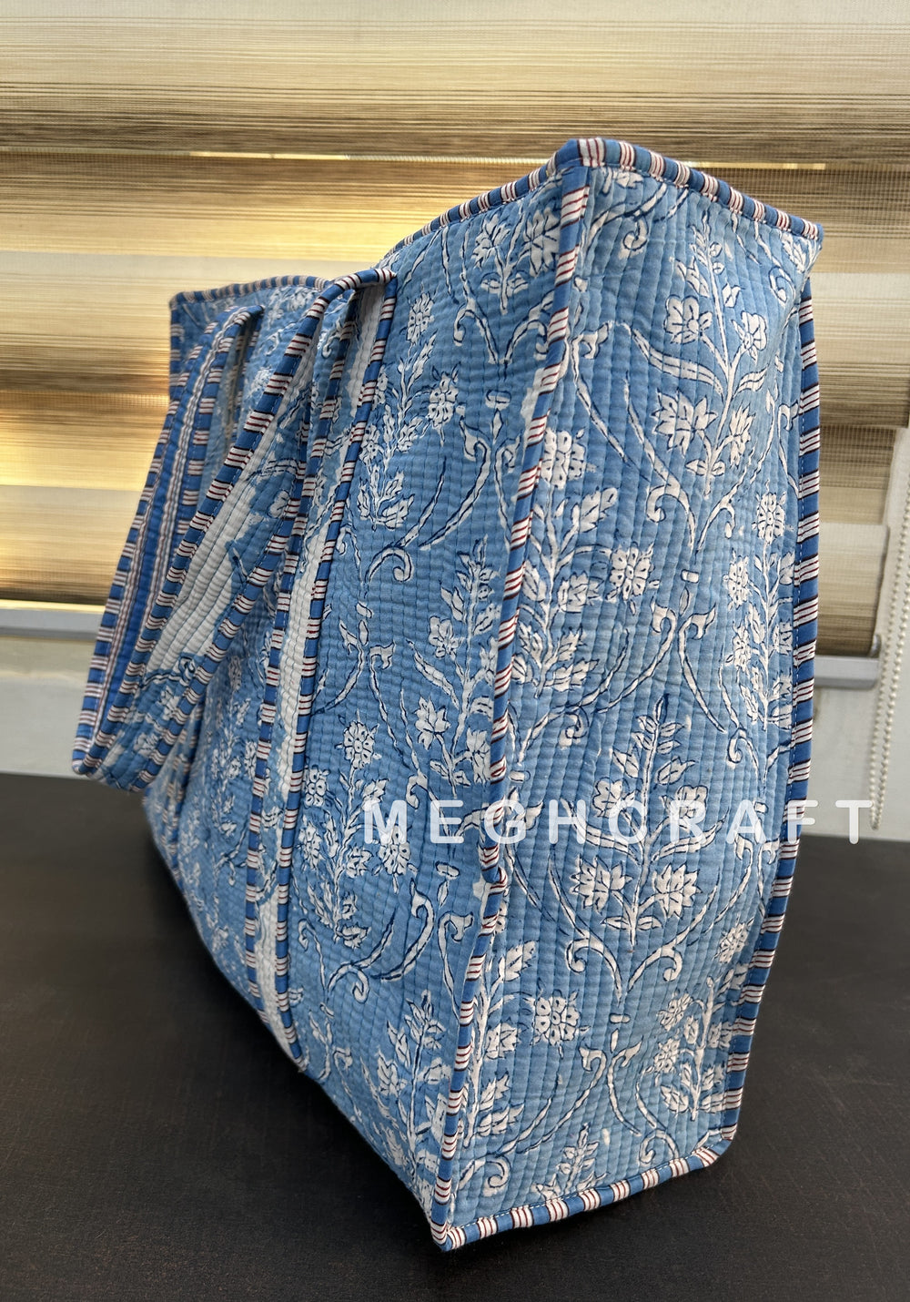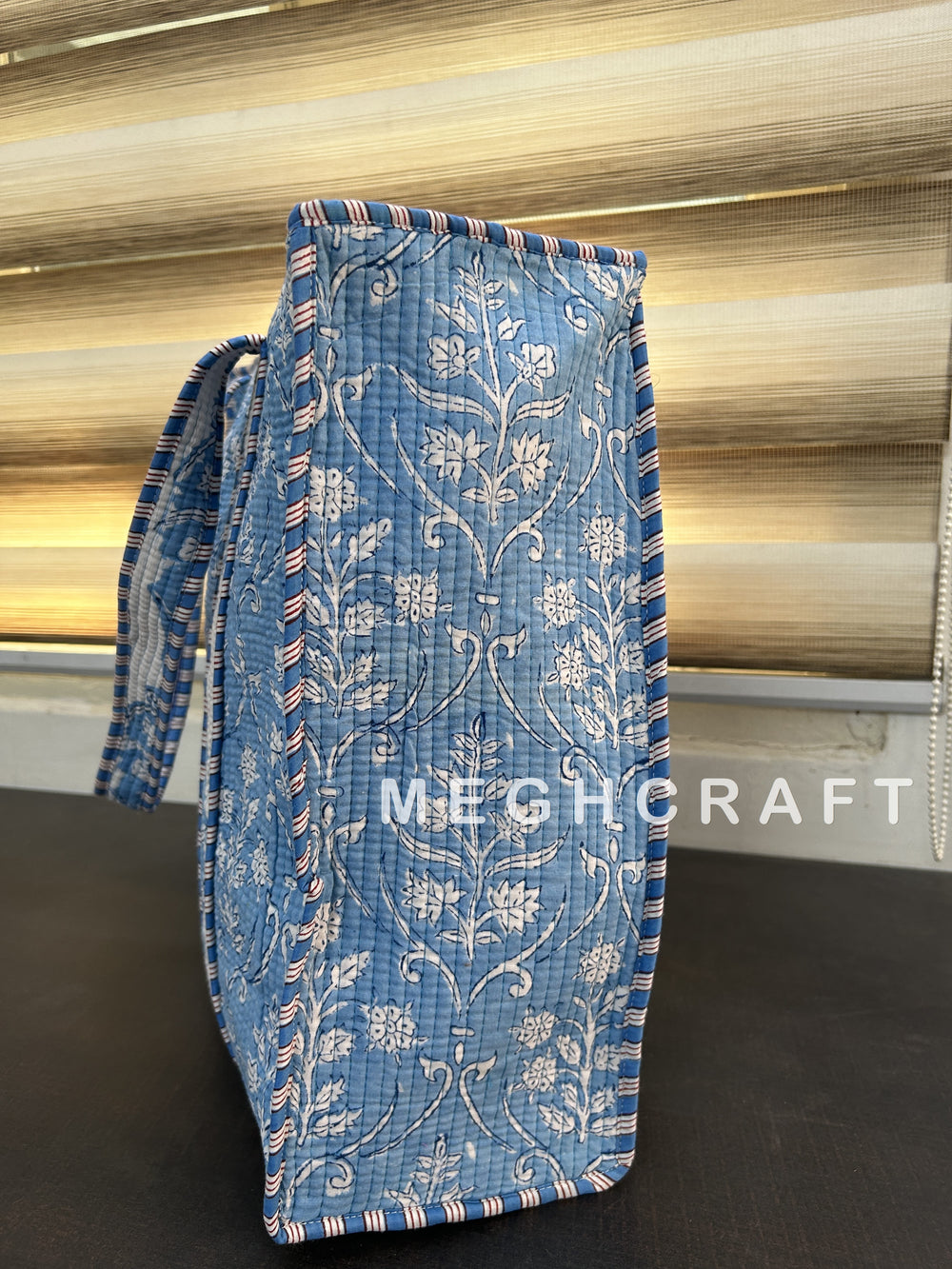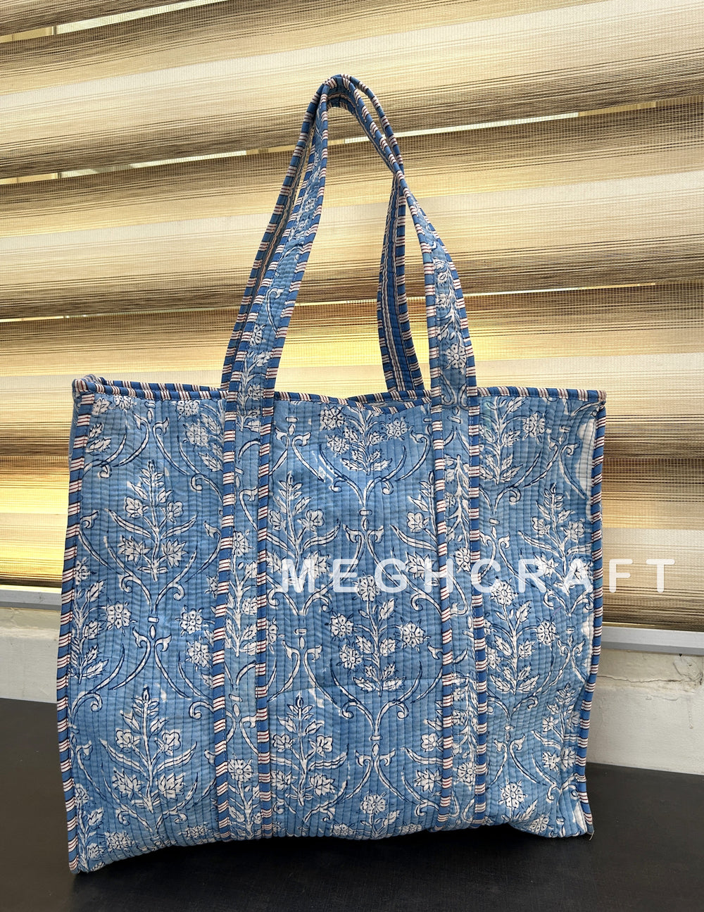 Cotton Quilted Tote Bag Perfect for a market tote, beach bag, weekender Bag, Shopping bags and much more! Handcrafted Indian cotton block-printed quilted tote bag with Zip closure, perfect for shopping, travel, or daily use. Features traditional patterns, durable and comfortable shoulder straps. Indian cotton, block print, quilted tote bag, shopping bag, shoulder bag, handcrafted, eco-friendly, traditional patterns, lightweight, spacious, reusable, artisanal, fair trade, sustainable.