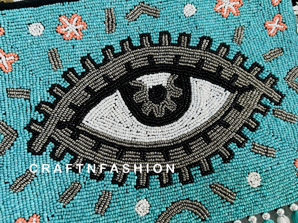 Handcrafted Evil Eye Jute Clutch, Exclusive Boho Fashion Jute Clutch Handbag. This is an authentic Hand embroidered Clutch with fringe. Woven Jute fabric on back with chain crossbody strap.