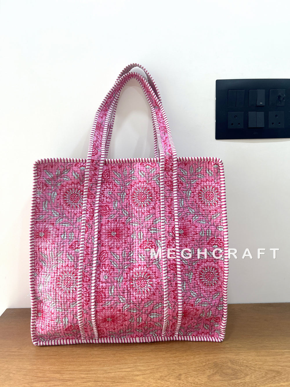 Our quilted totes are handmade by Indian artisans, so there may be some irregularities, and the print placement may vary by bag.