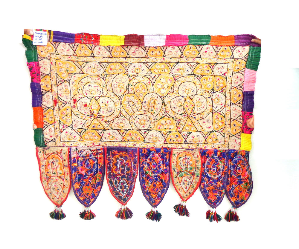 This Antique Banjara Gypsy bohemian or "Indian vintage” sturdy cotton hand embroidered toran (Door hanging) from Kutch Gujarat. The interplay of geometric forms with vibrant colors in a simple, unpretentious. A "Tribal" design is classic style which effective in conveying the adoration that went into it's creation. It is designed to hang above a door or window, however, it would be equally suitable as a footer on the end of a bed or one the back of a sofa or as a table runner. Heck, wrap it around your body and wear it as retro-ethnic.Created by the skilled tribal woman of Gujarat